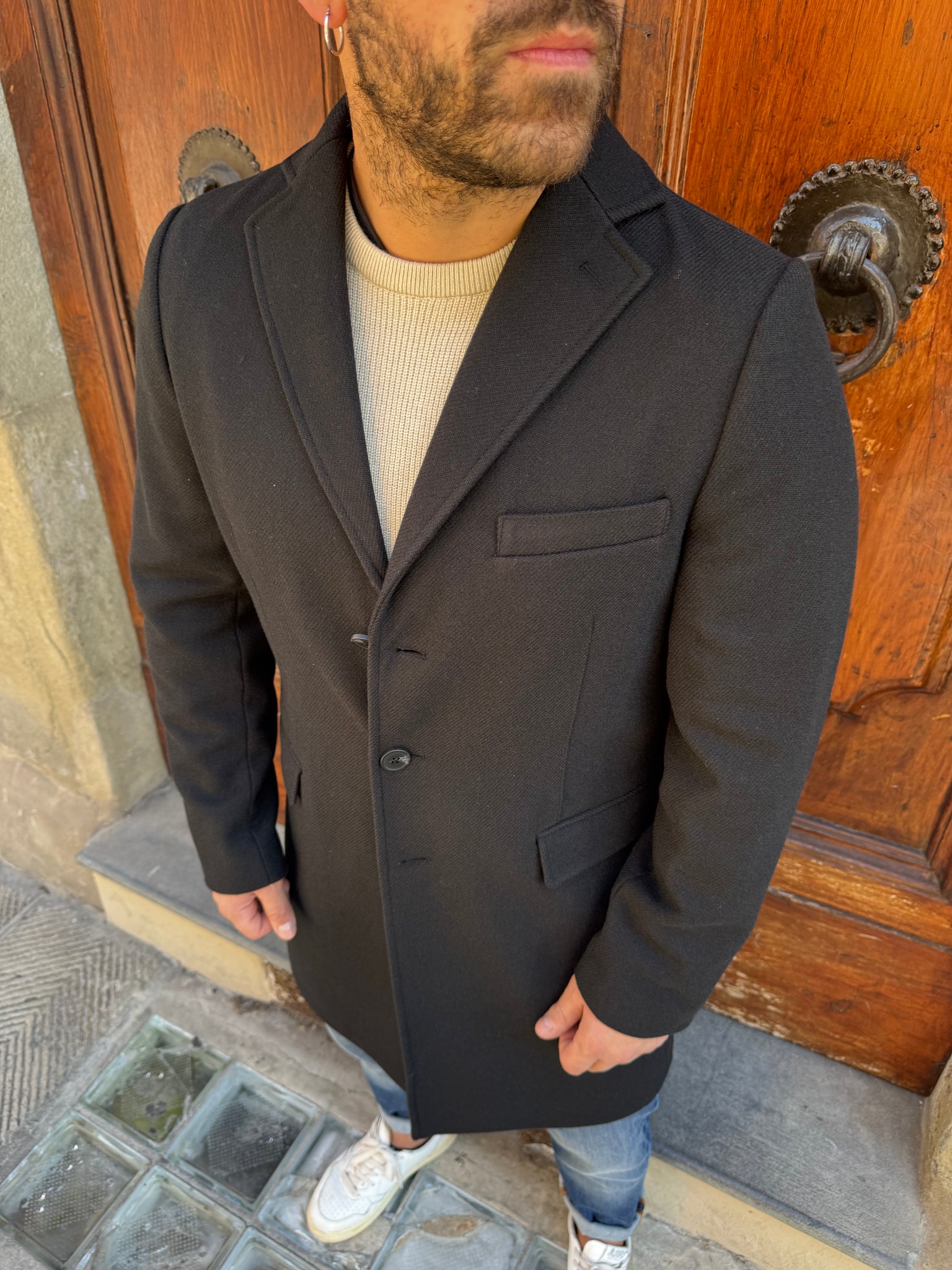 Cappotto Dandy di HAMAKI, tessuto operato spigato, foderato internamente, scollo a giacca, tasche a scomparsa laterali, vestibilità slim, il modello è alto 1.70 per 77 kg e indossa una 48. Disponibile verde e nero .