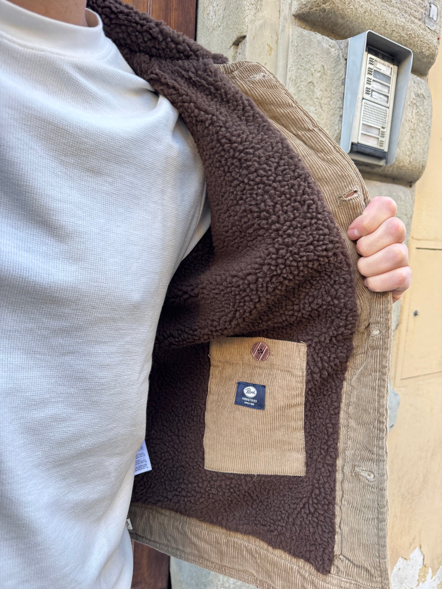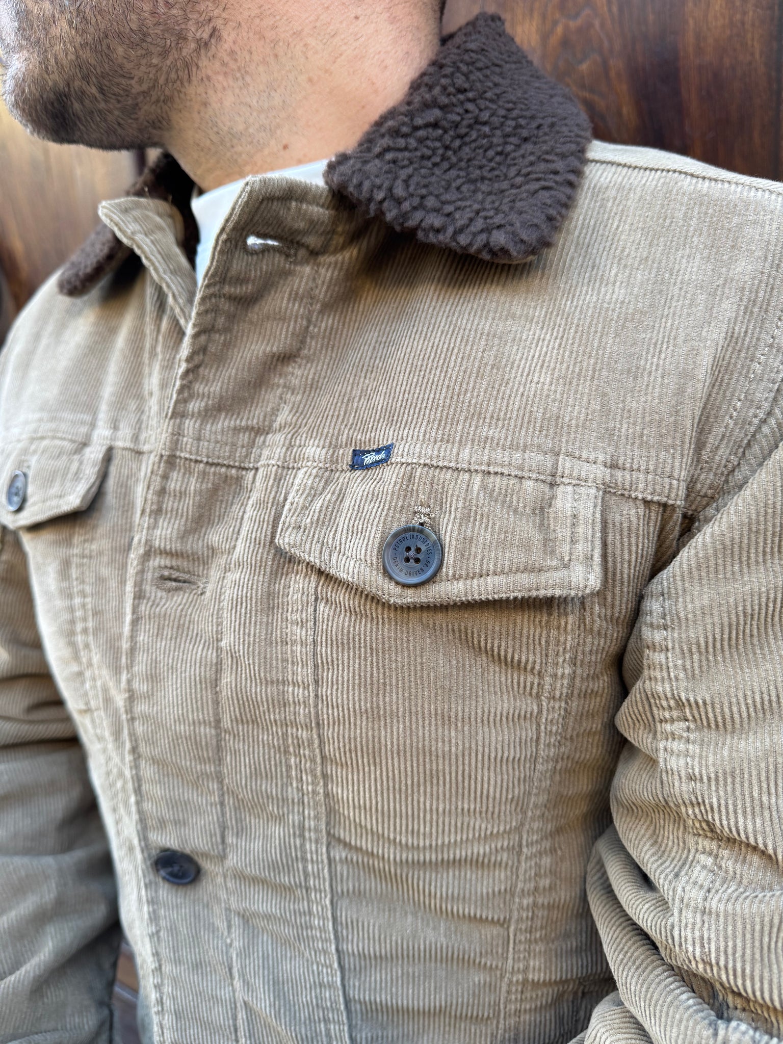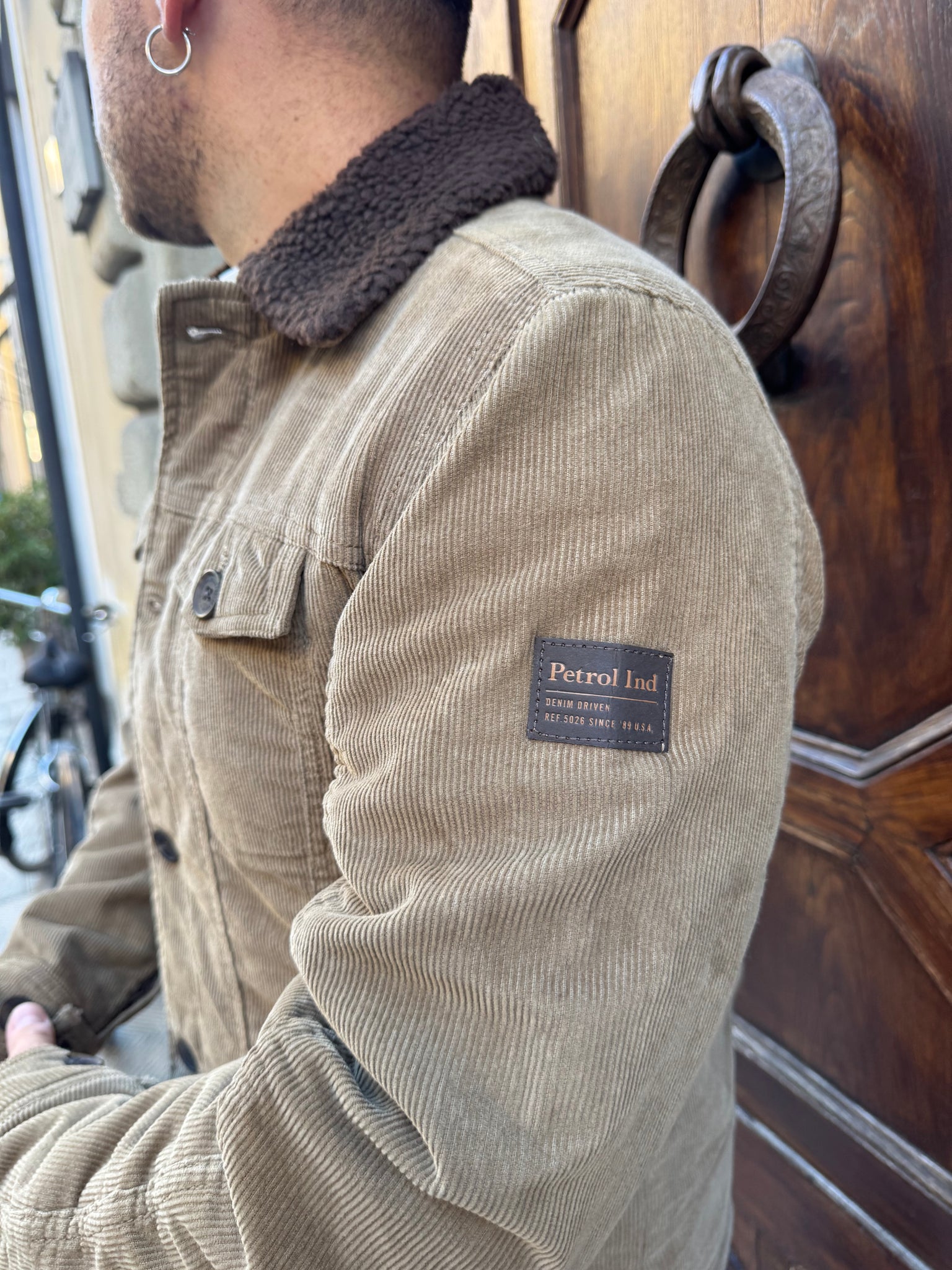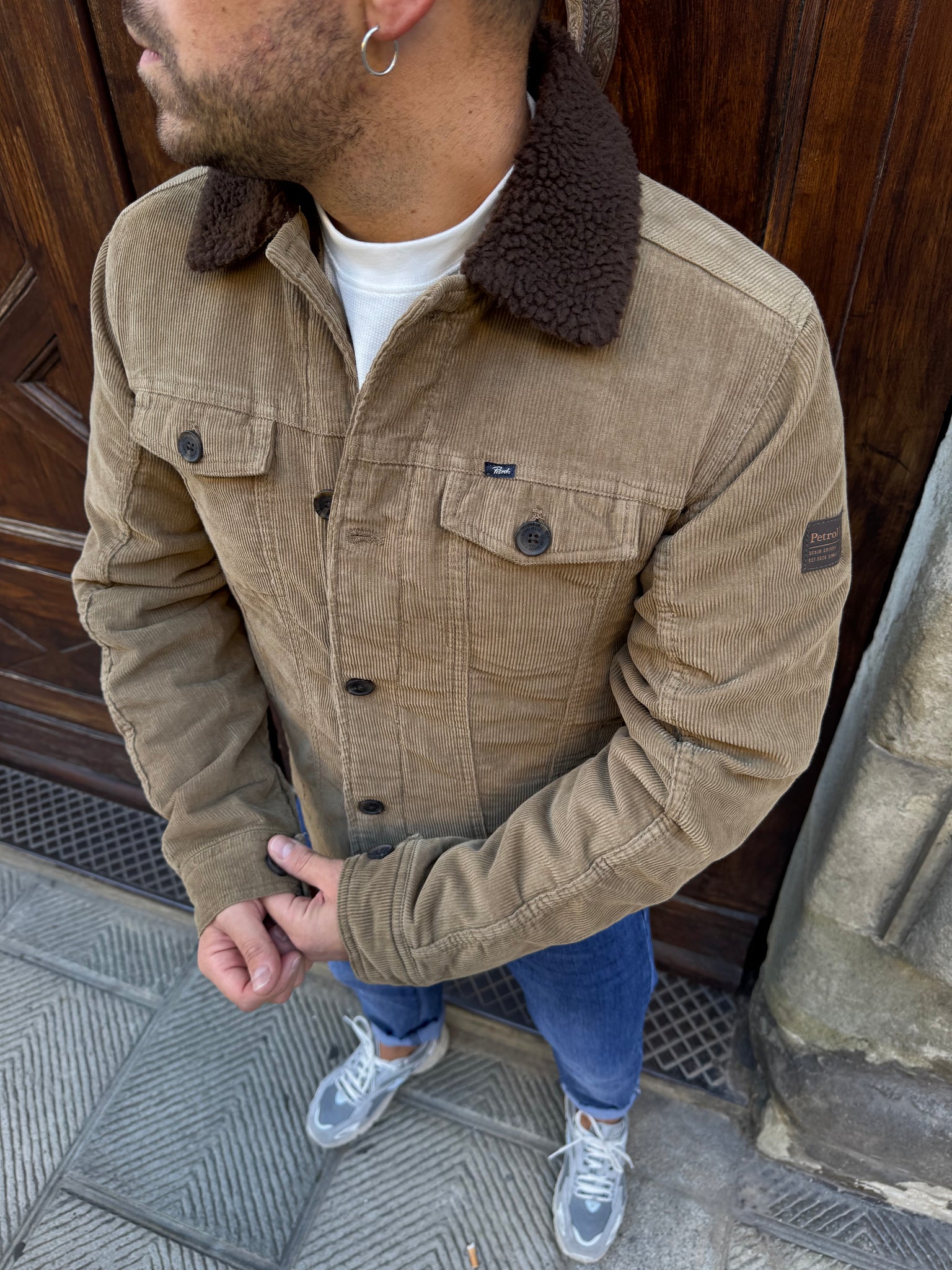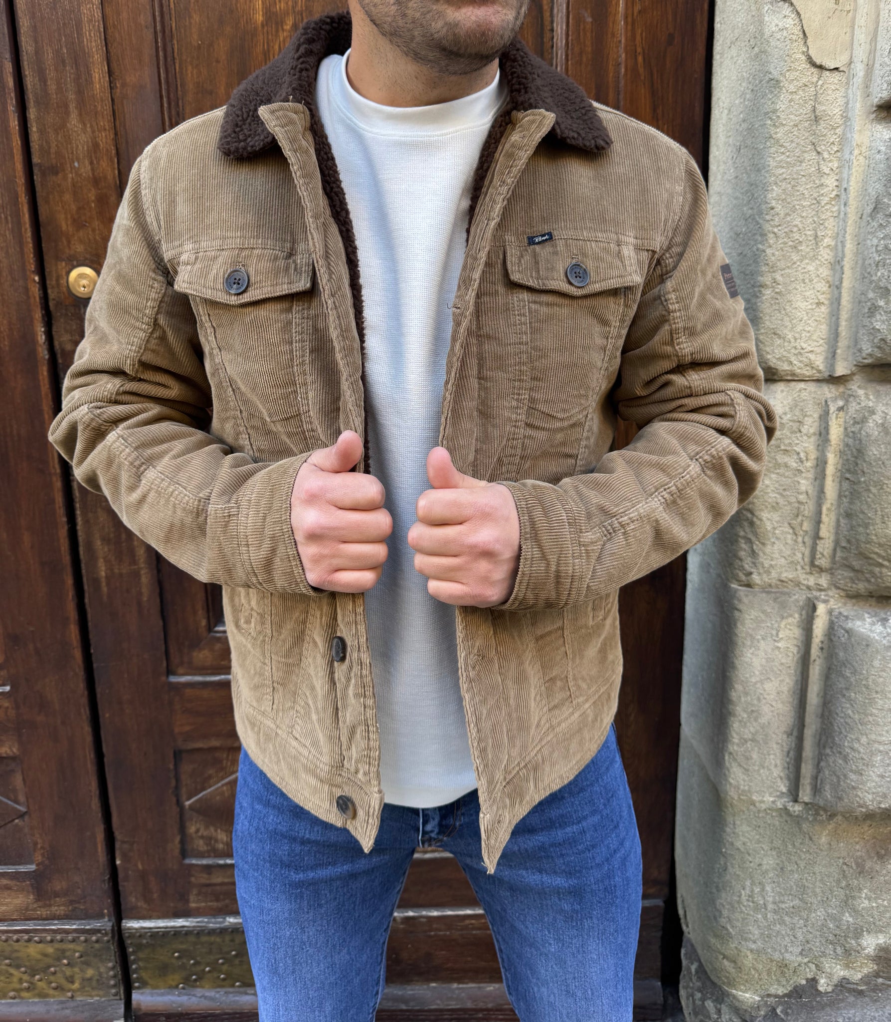Giacchetto in velluto di PETROL , collo in pelliccia, interno imbottito in pelliccia, tasche altezza petto frontali, vestibilità regular, il modello è alto 1.70 per 77 kg e indossa una M.