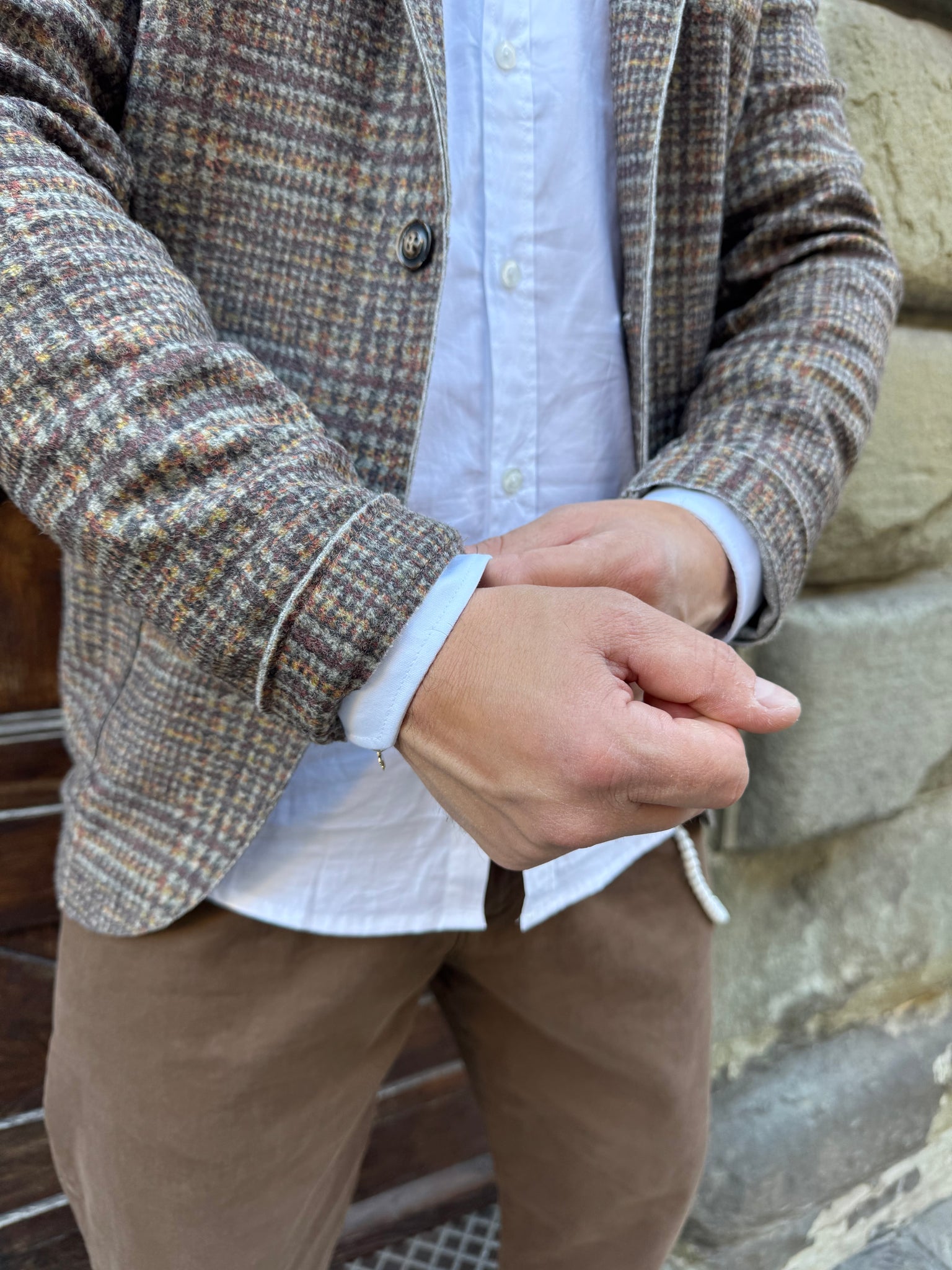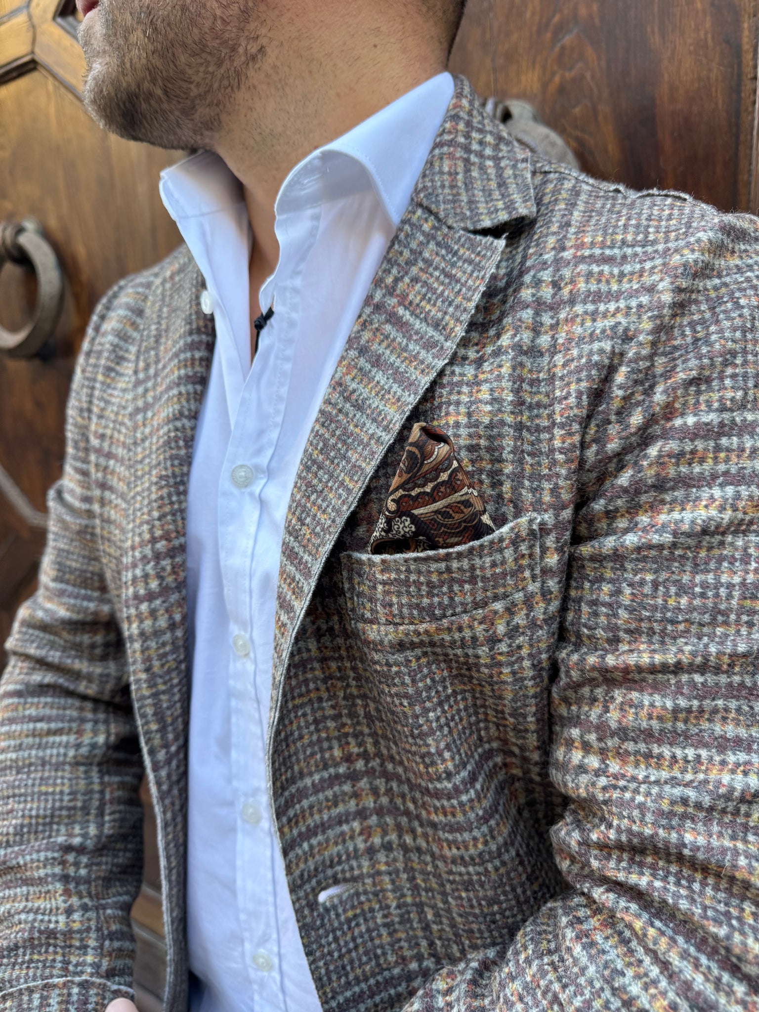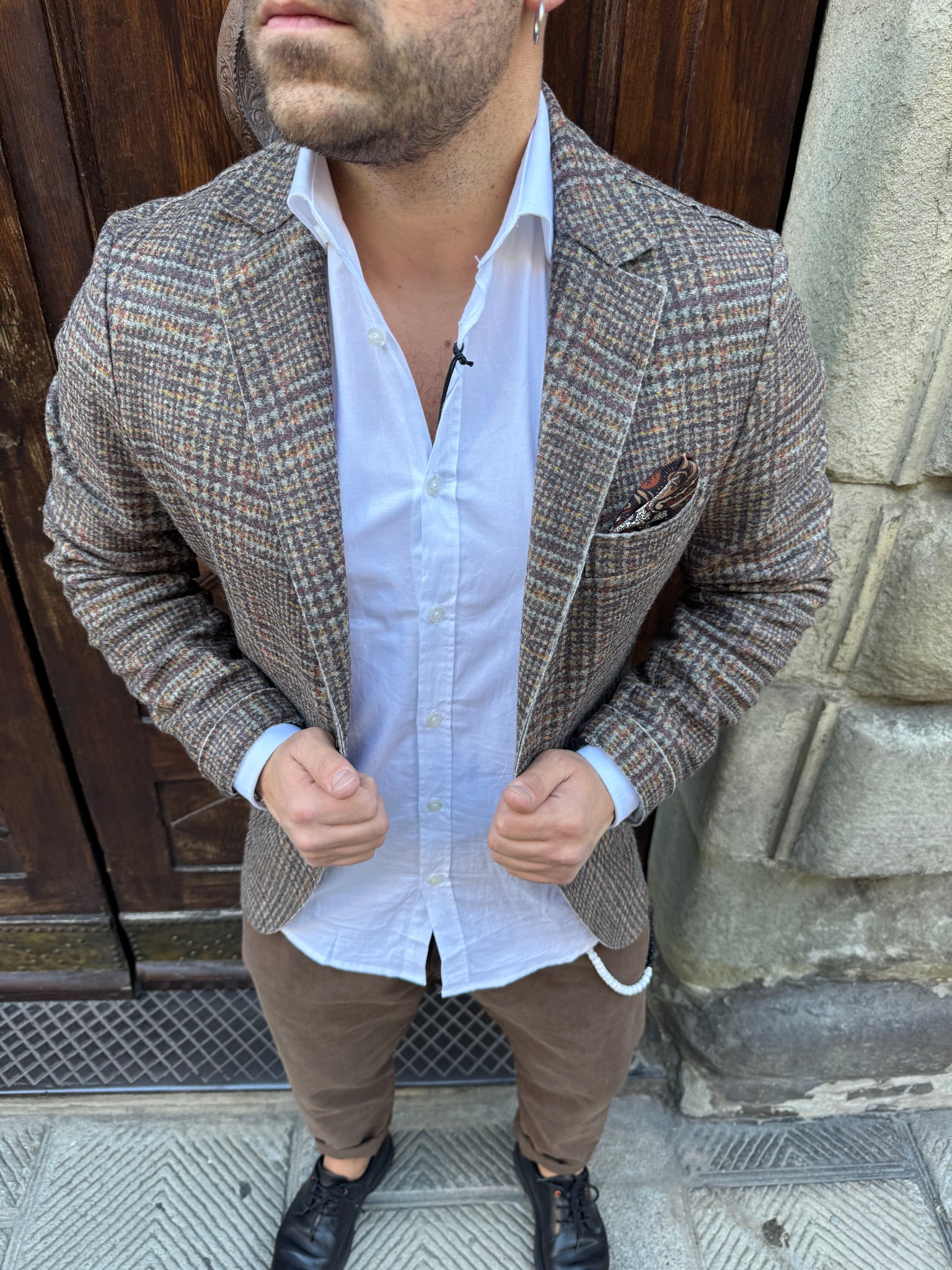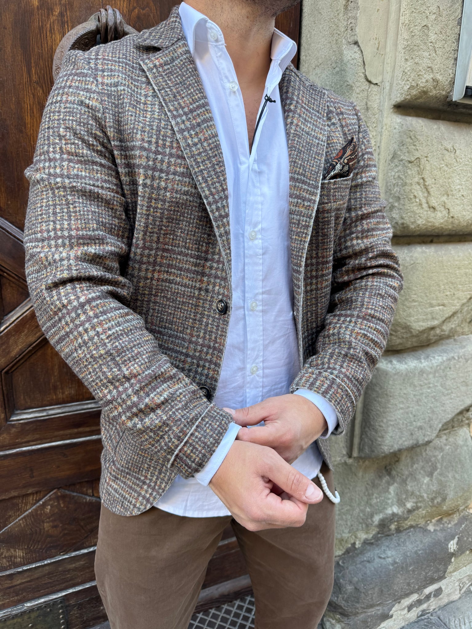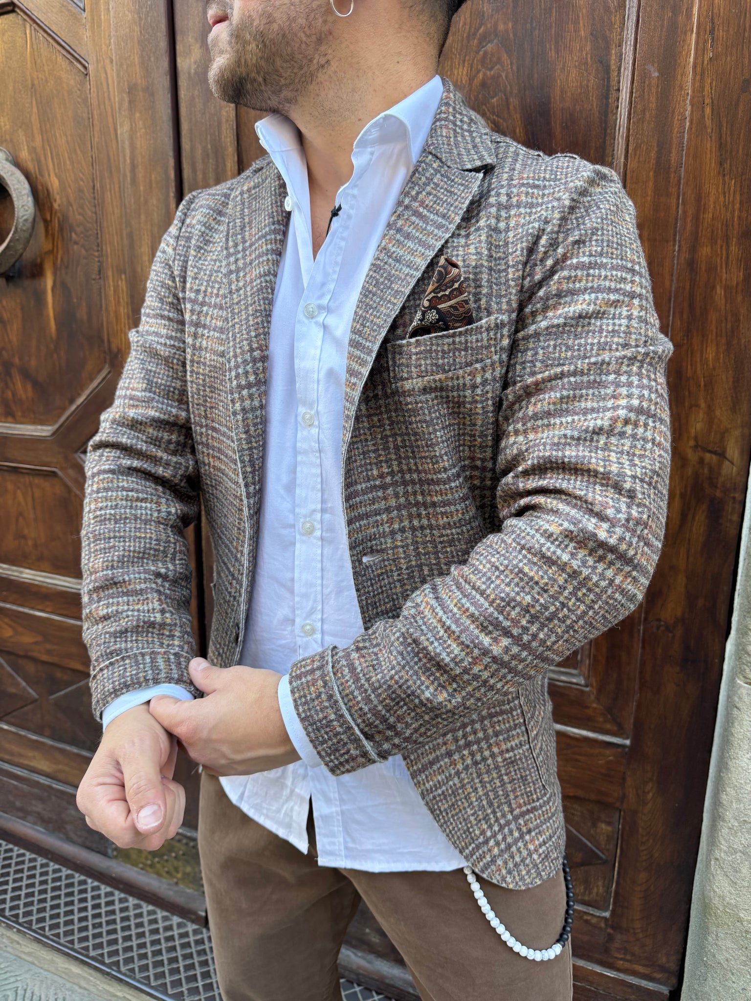 Giacca Galles di 3.9 in misto lana vergine, fantasia principe di Galles, taschino con pochette integrata, tasche a toppa, taglio vivo a laser, vestibilità slim, il modello è alto 1.70 per 80 kg e indossa una L.