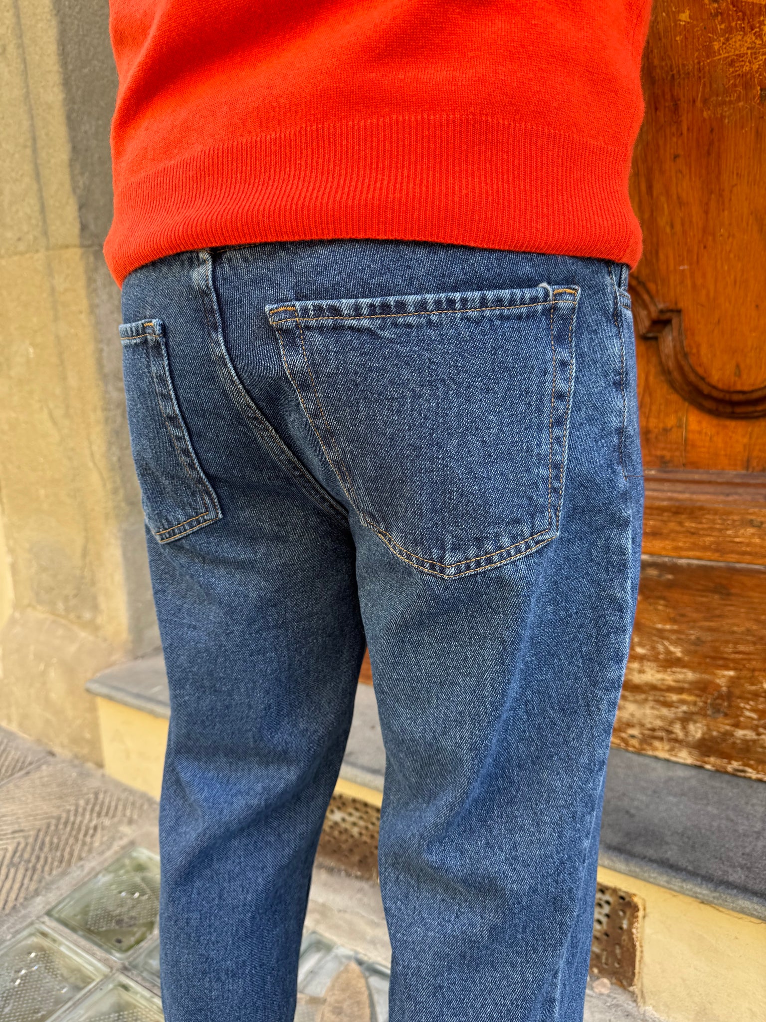 Jeans James di Telamira, lavaggio scuro, vestibilità cropped, catena in omaggio, il modello è alto 1.70 per 77 kg e indossa una 46.