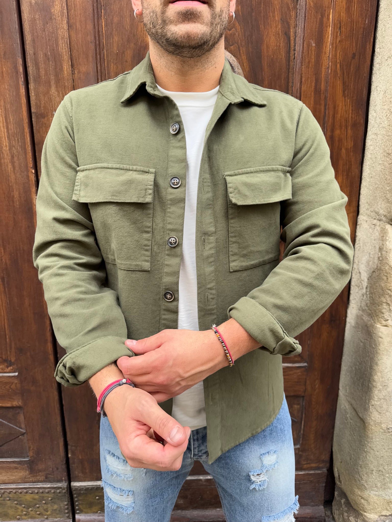 Camicia Sahara di 3.9 in fustagno , maxi tasche altezza petto frontali, ideale per ogni stagione, vestibilità regular , il modello è alto 1.70 per 80 kg circa e indossa una M. Disponibile tabacco e verde militare .