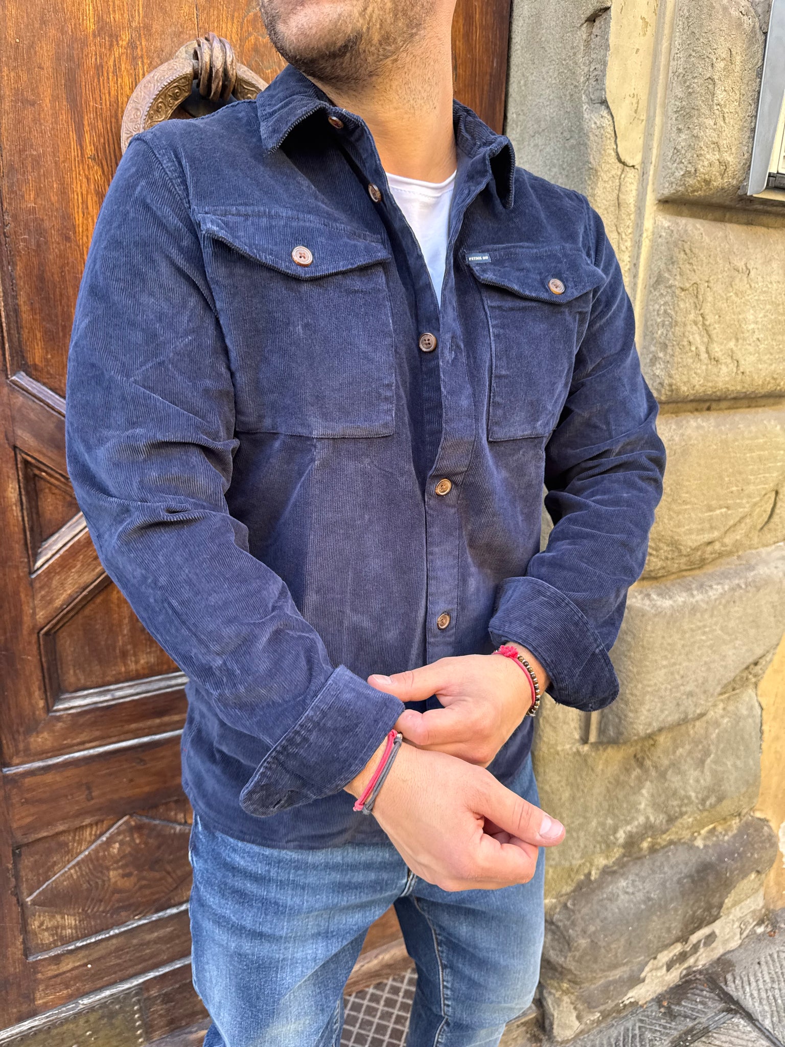 Maxi camicia di PETROL in velluto, colletto Classic, tasche altezza petto frontali, vestibilità regular, il modello è alto 1.70 per 77 kg e indossa una S. Disponibile blu o crema.