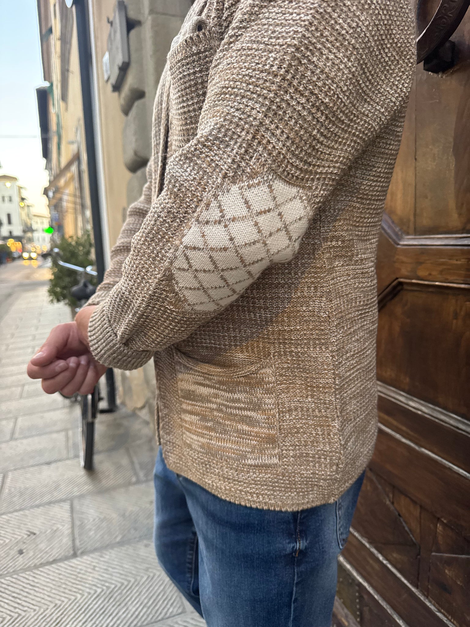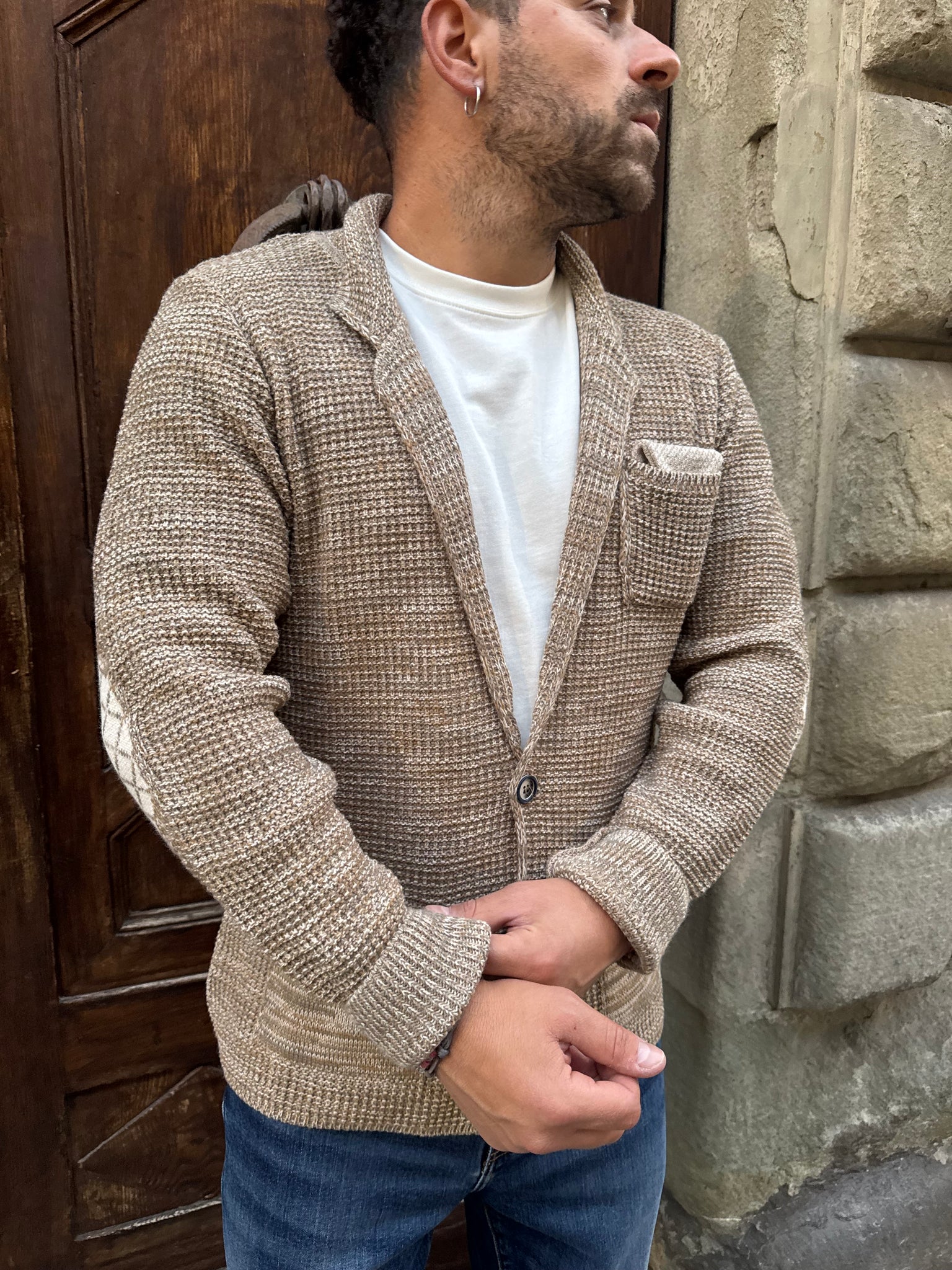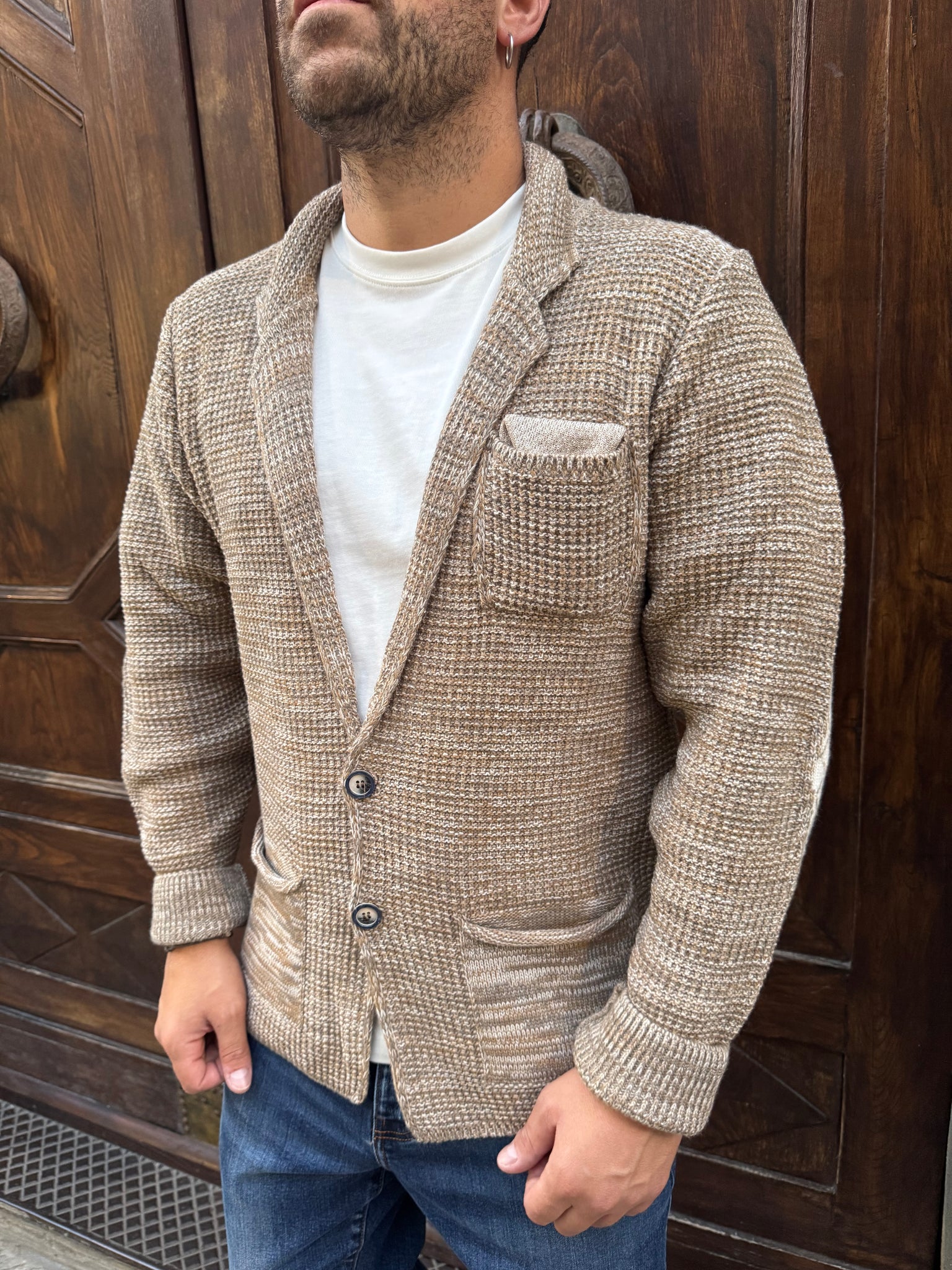 Giacca Cardigan Jason di Myden in misto lana, vestibilità regular, il modello è alto 1.70 per 77 kg e indossa una M.