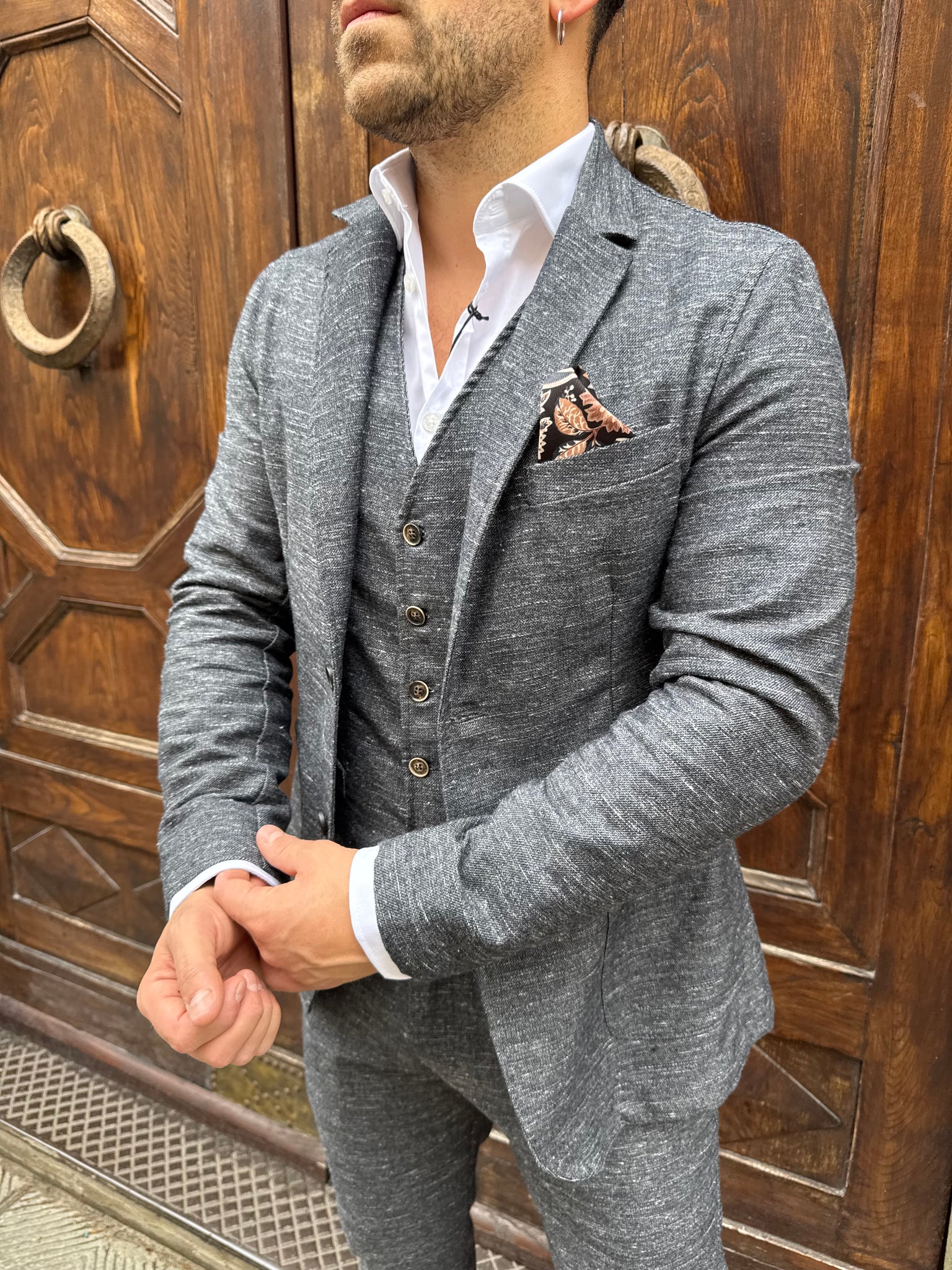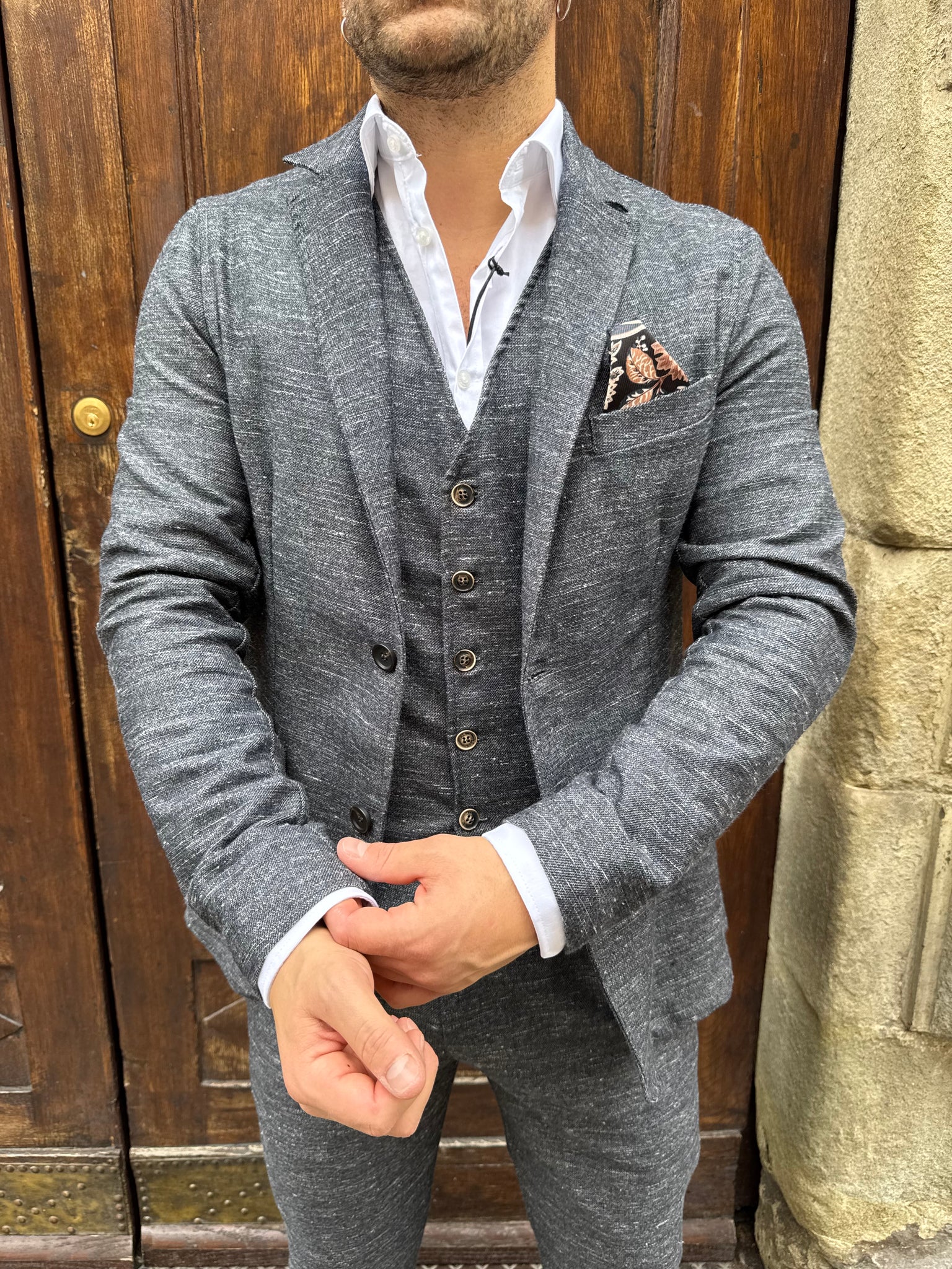 Giacca completo Florence di 3.9, taschino con pochette integrata, tasche a toppa, vestibilità slim , il modello è alto 1.70 per 77 kg e indossa una M.