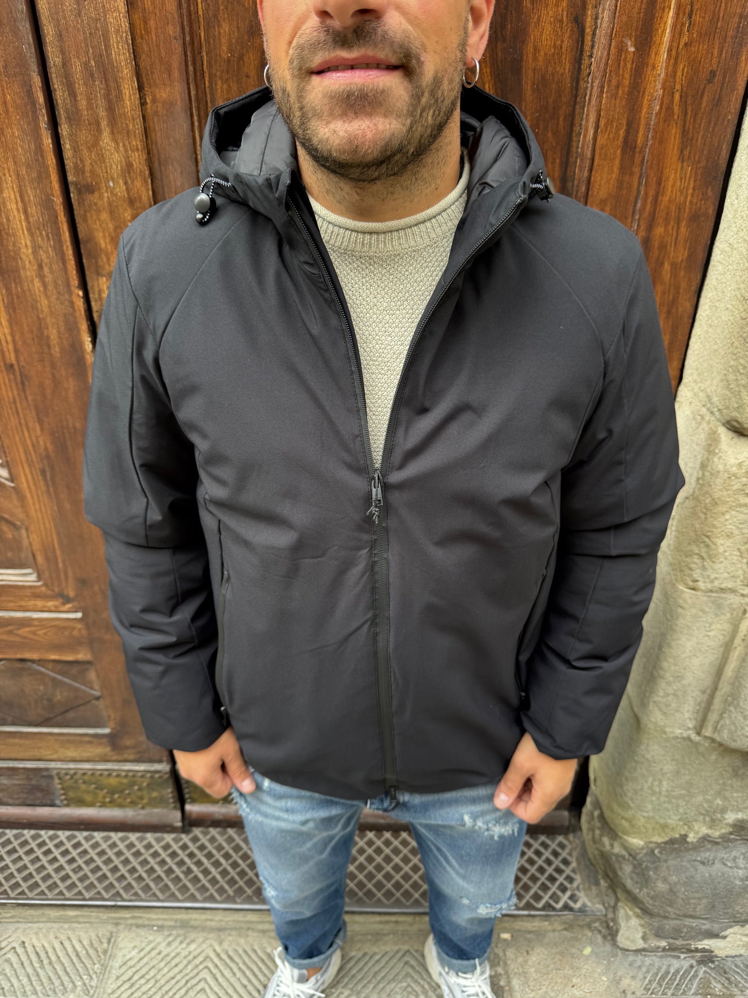 Giacchetto Joy di HAMAKI , anti pioggia e antivento, imbottito, cappuccio, chiusura frontale con zip e cerniera termosaldata, tasche laterali con zip e cerniera termosaldata.