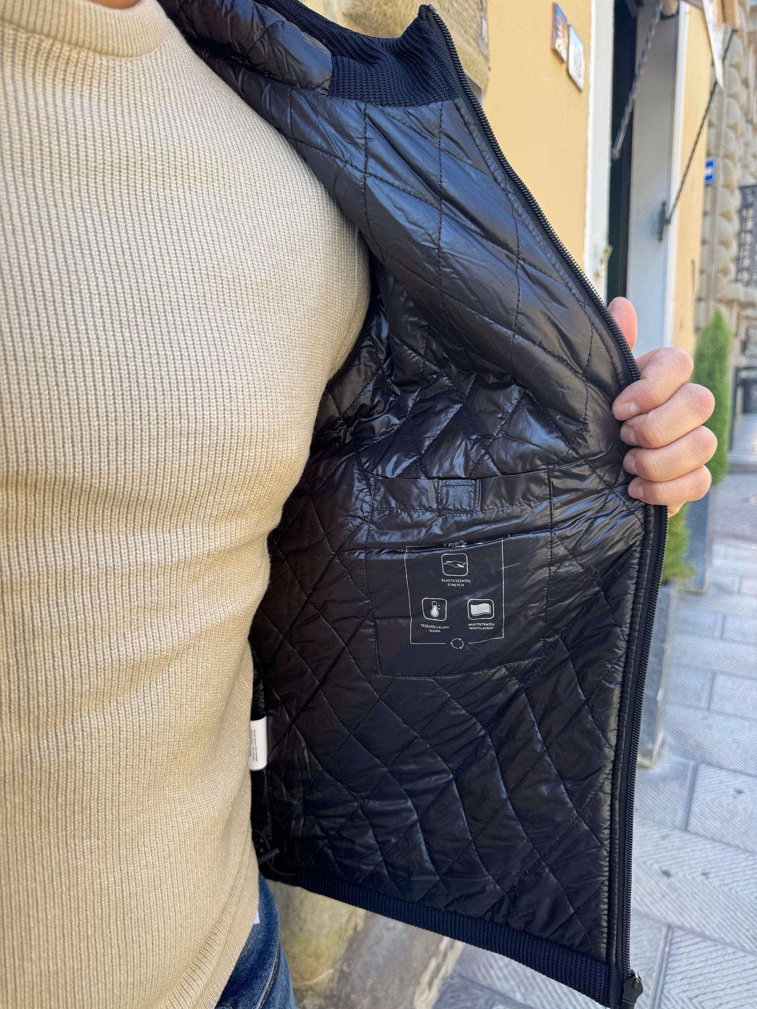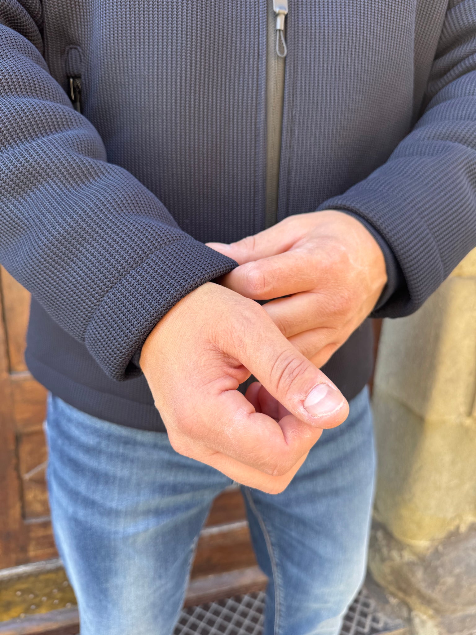 Giacchetto Richard di TRÈZ , tessuto operato, cappuccio , imbottito abbastanza per le temperature più basse, chiusura con cerniera, tasche laterali, vestibilità regular, il modello è alto 1.70 per 77 kg e indossa una M. Disponibile blu e verde .
