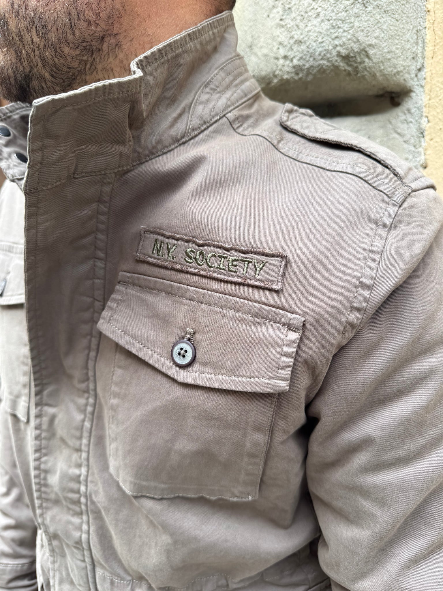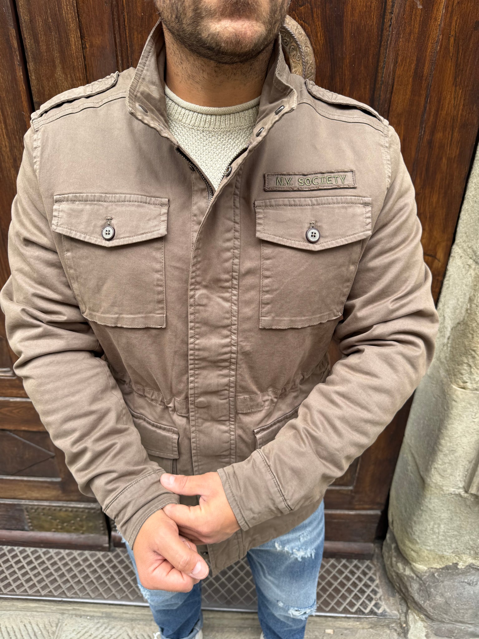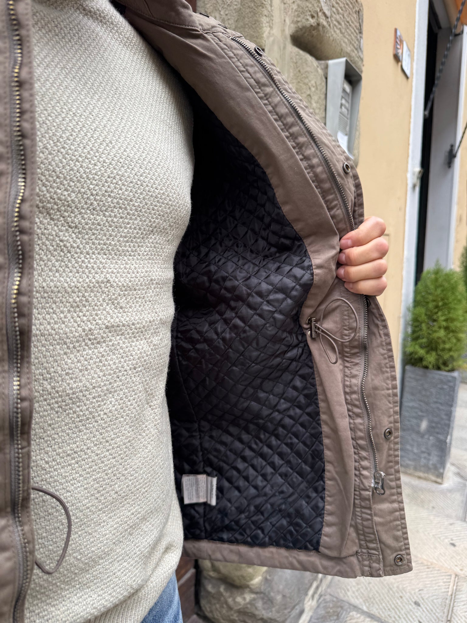 Giacchetta Sahariana di TRÈZ, tasche frontali, imbottitura interna , regolabile con il laccino in vita, vestibilità regular, il modello è alto 1.70 per 80 kg e indossa una M. Disponibile verde e fango .