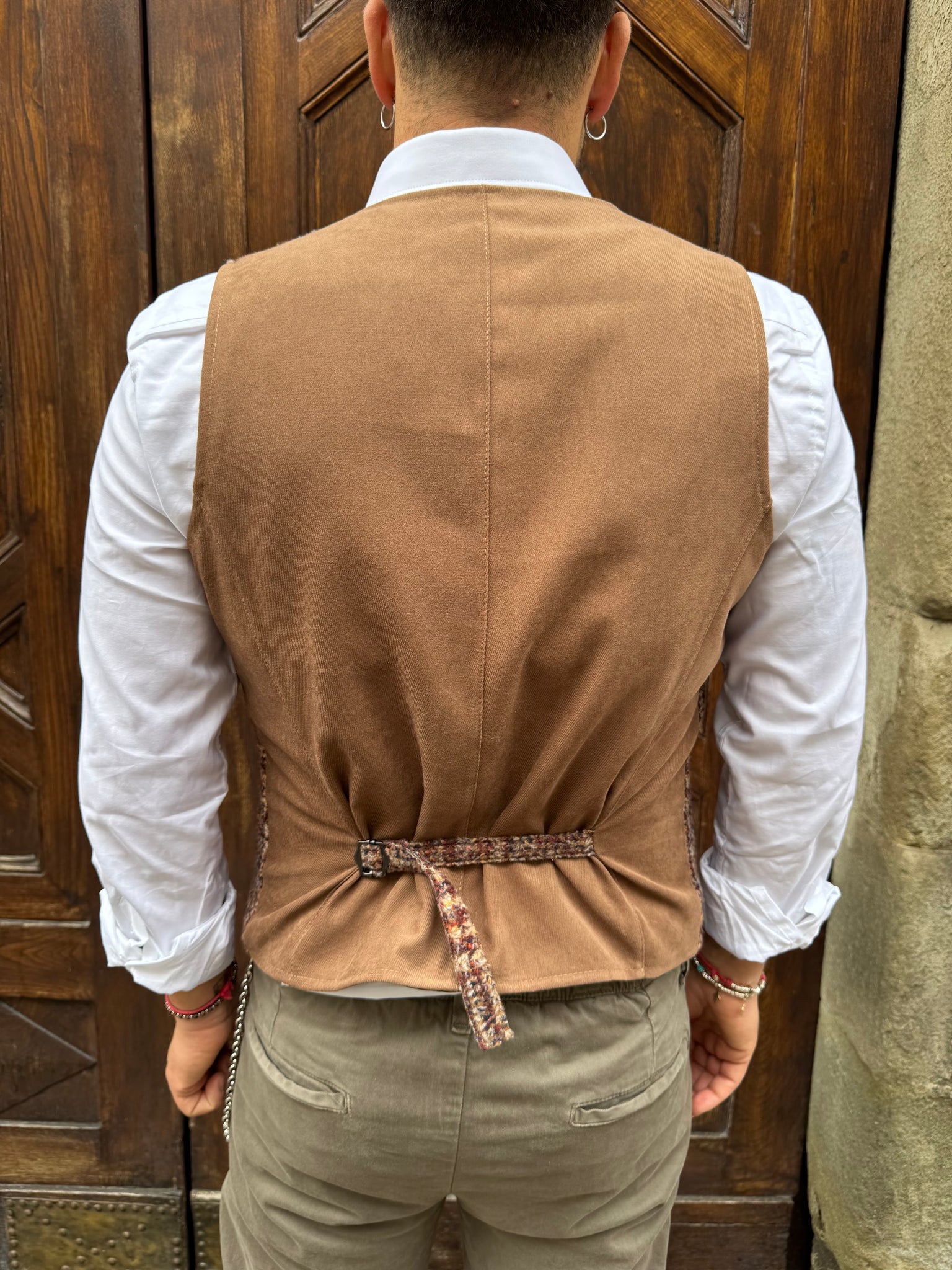 Gilet Galles di 3.9, fantasia a quadri , tessuto sostenuto in misto lana, tasche a toppa, vestibilità slim, il modello è alto 1.70 per 77 kg e indossa una L.