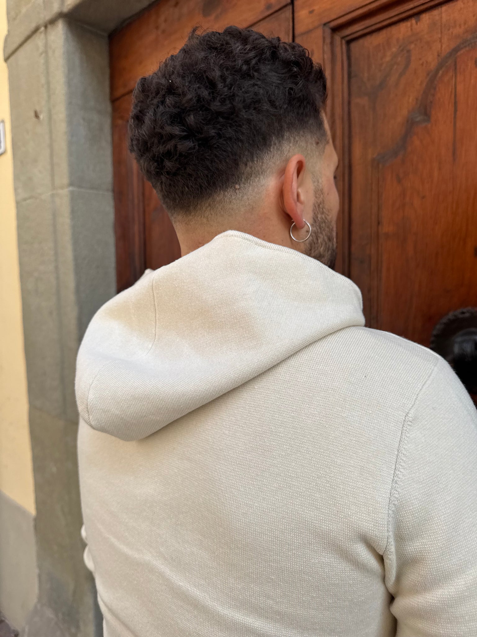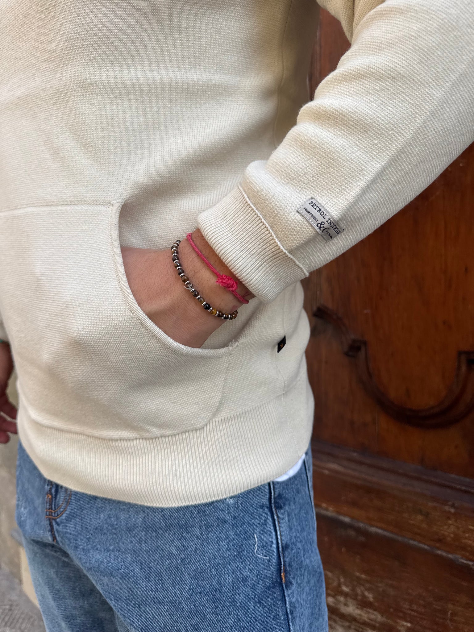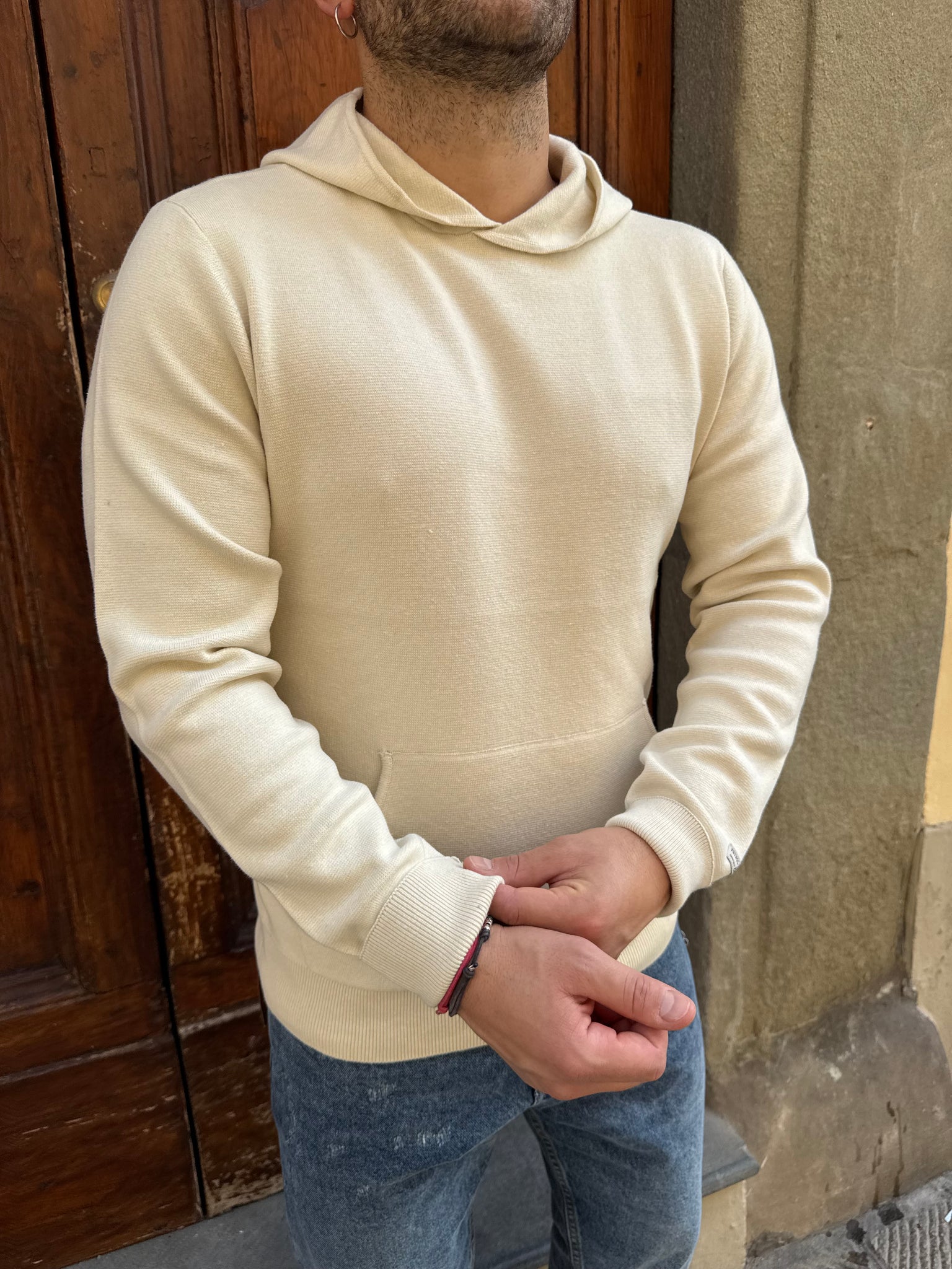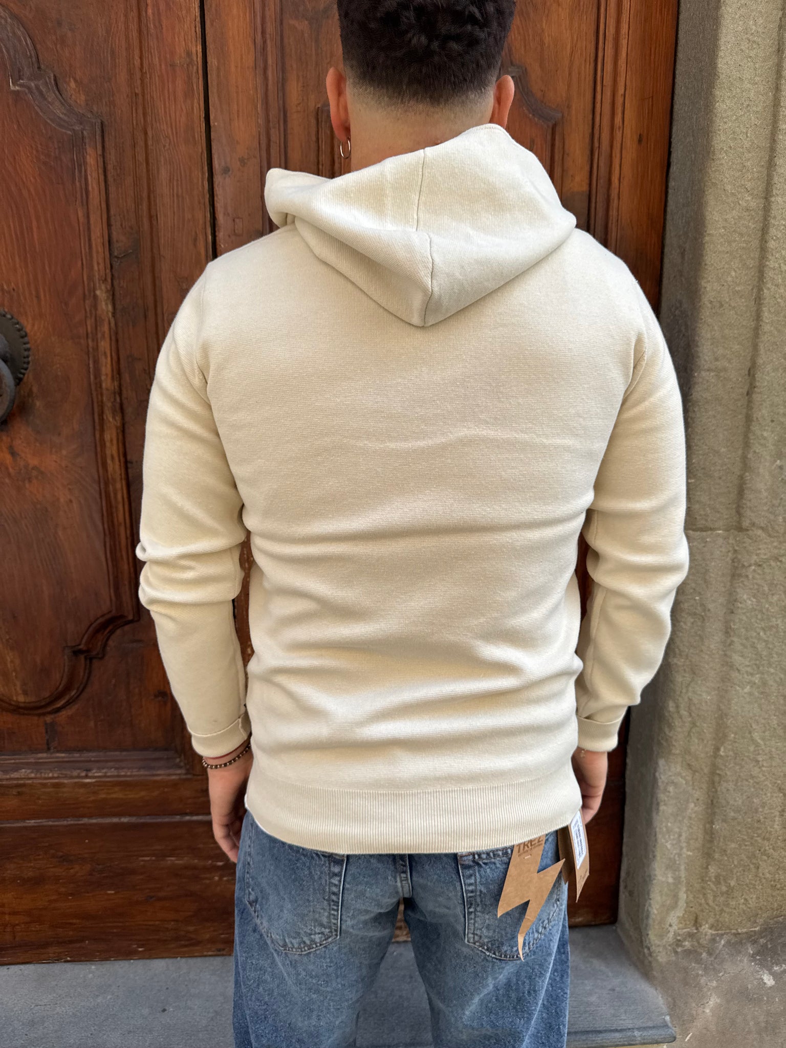 Maglioncino Denver di Petrol, tasche anteriori e cappuccio, morbido e calduccio,vestibilità slim,  il modello è alto 1.70 per 77 kg e indossa una S.