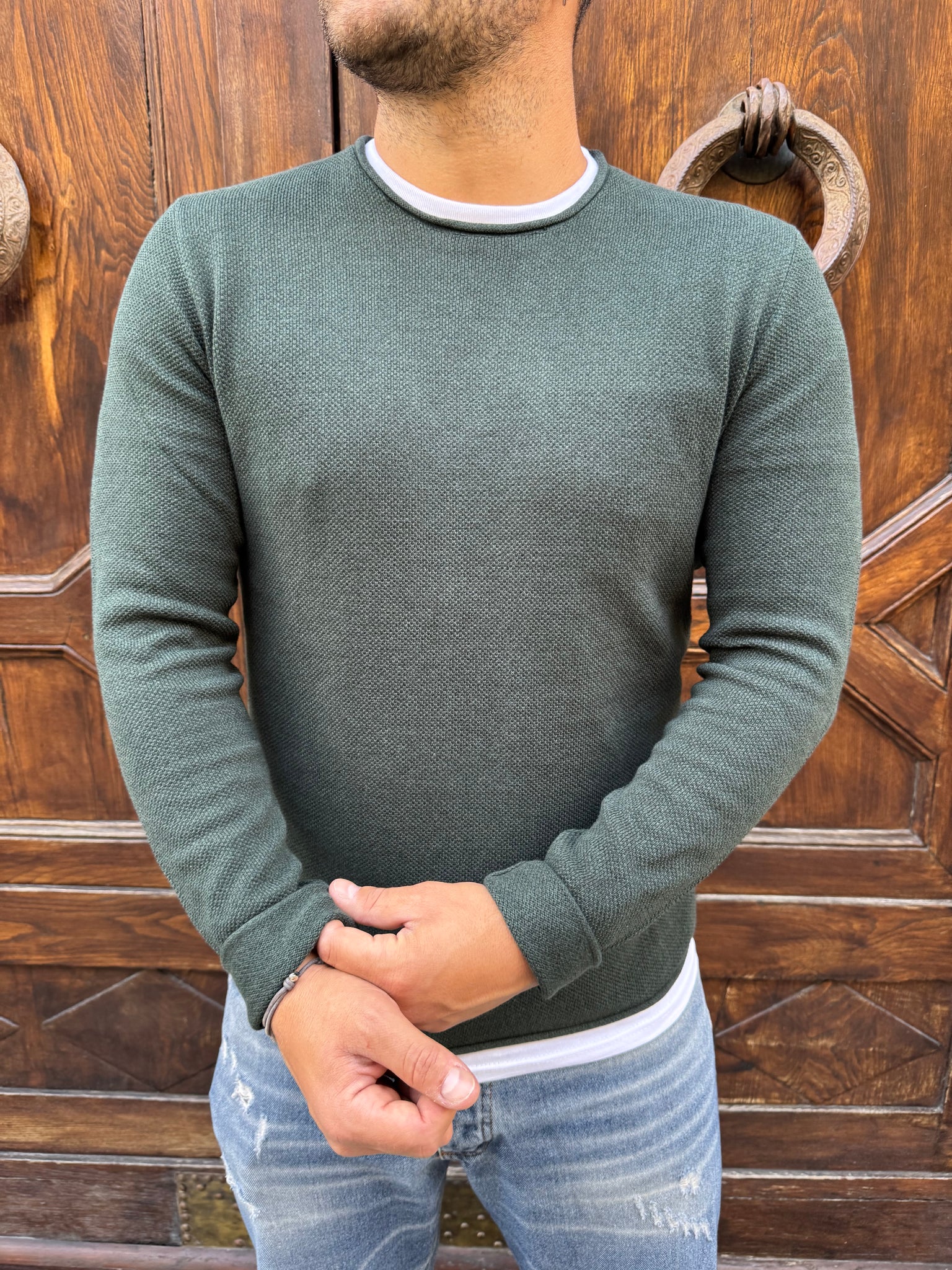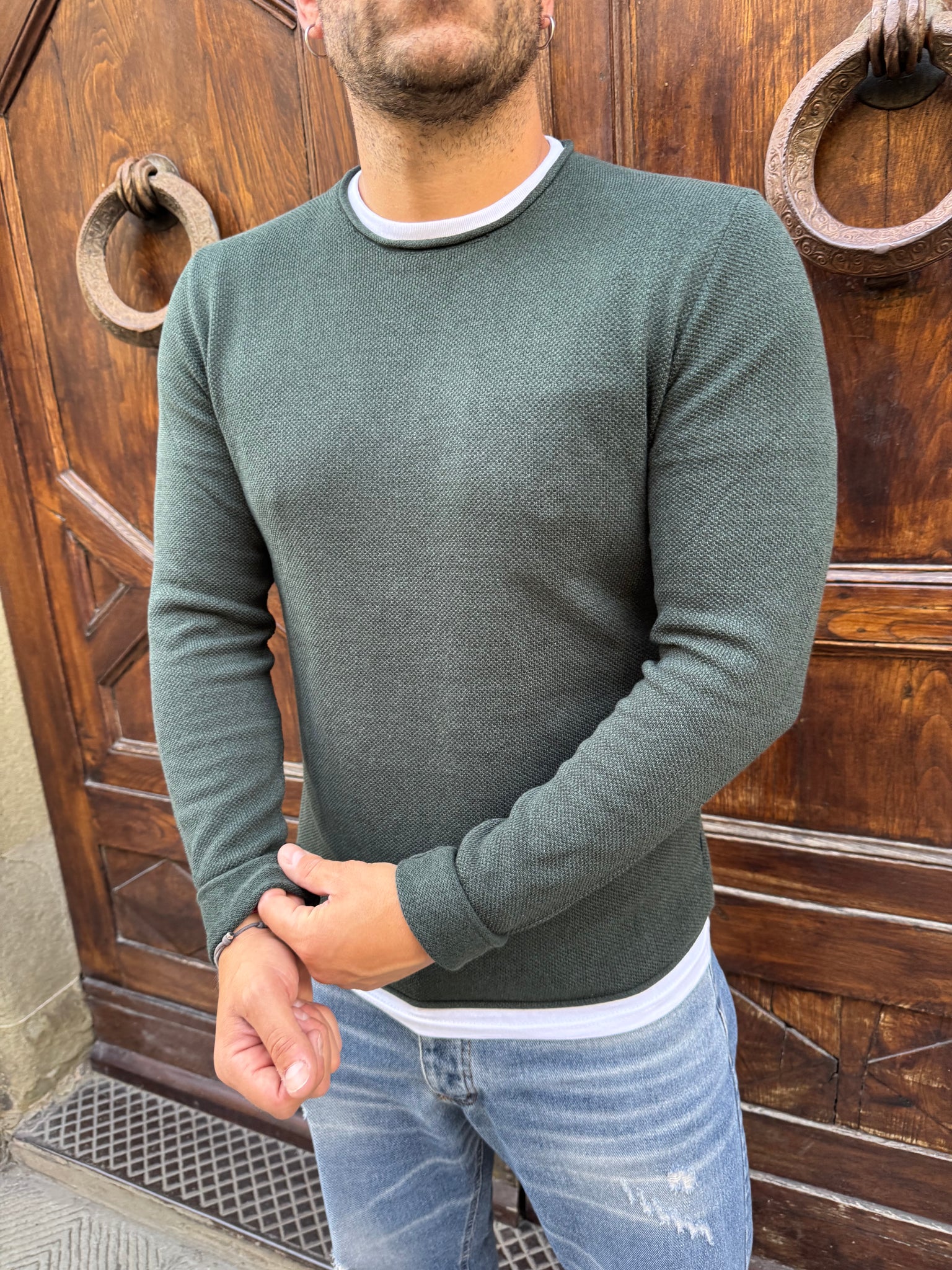 Maglioncino Alabastro di Tiffosi in cotone ,trama chicco di riso, colletto e balsa con t- shirt cucita, vestibilità regular, il modello è alto 1.70 per 80 kg e indossa una M.