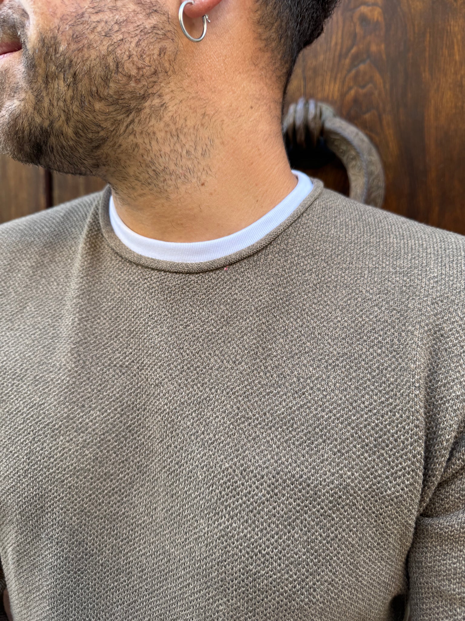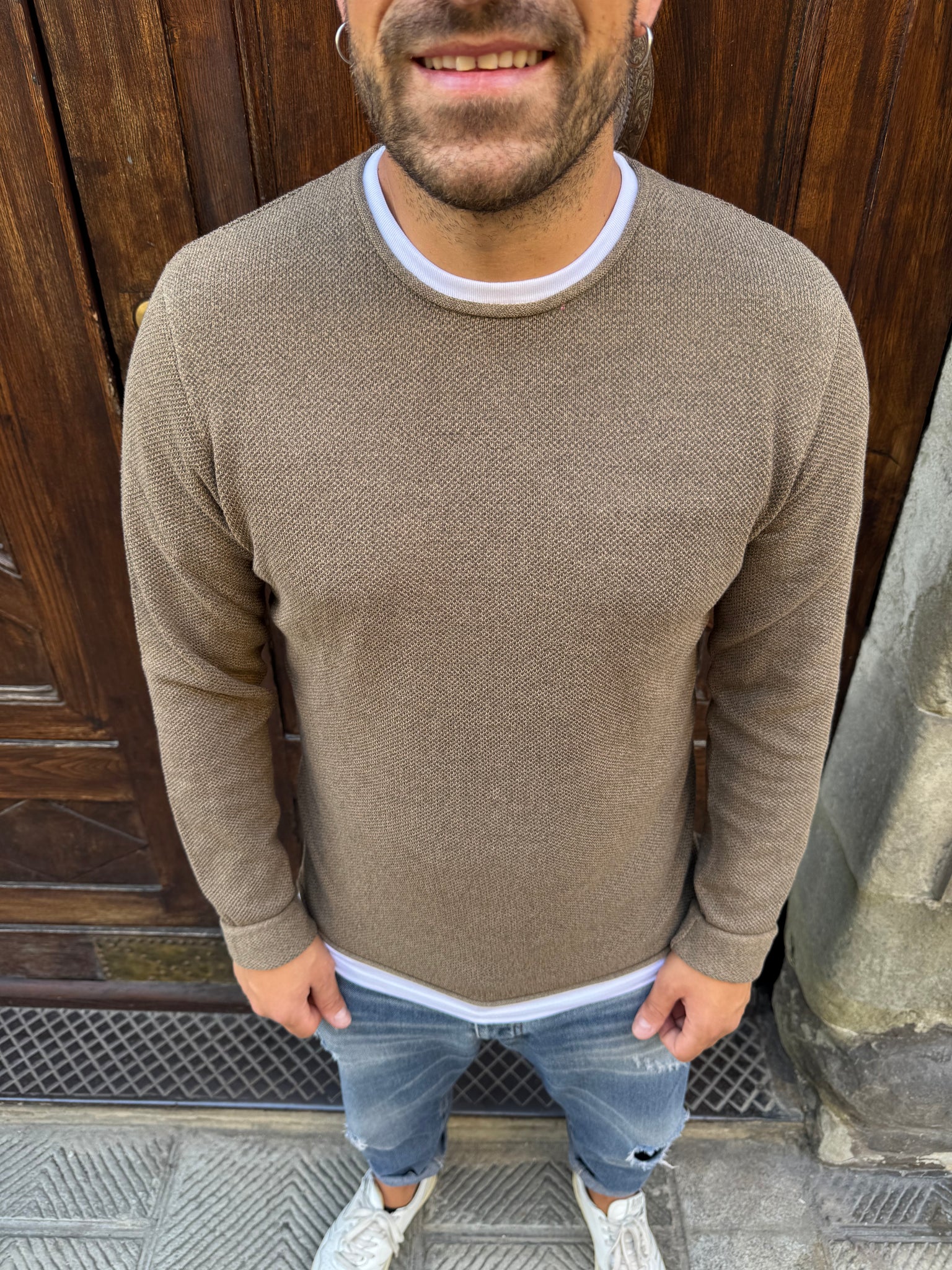 Maglioncino Alabastro di Tiffosi in cotone ,trama chicco di riso, colletto e balsa con t- shirt cucita, vestibilità regular, il modello è alto 1.70 per 80 kg e indossa una M.