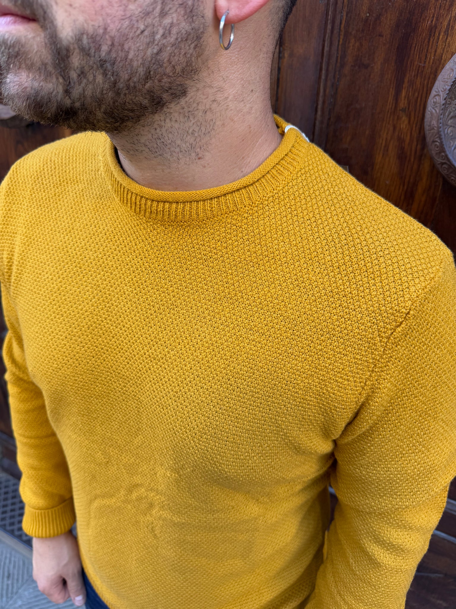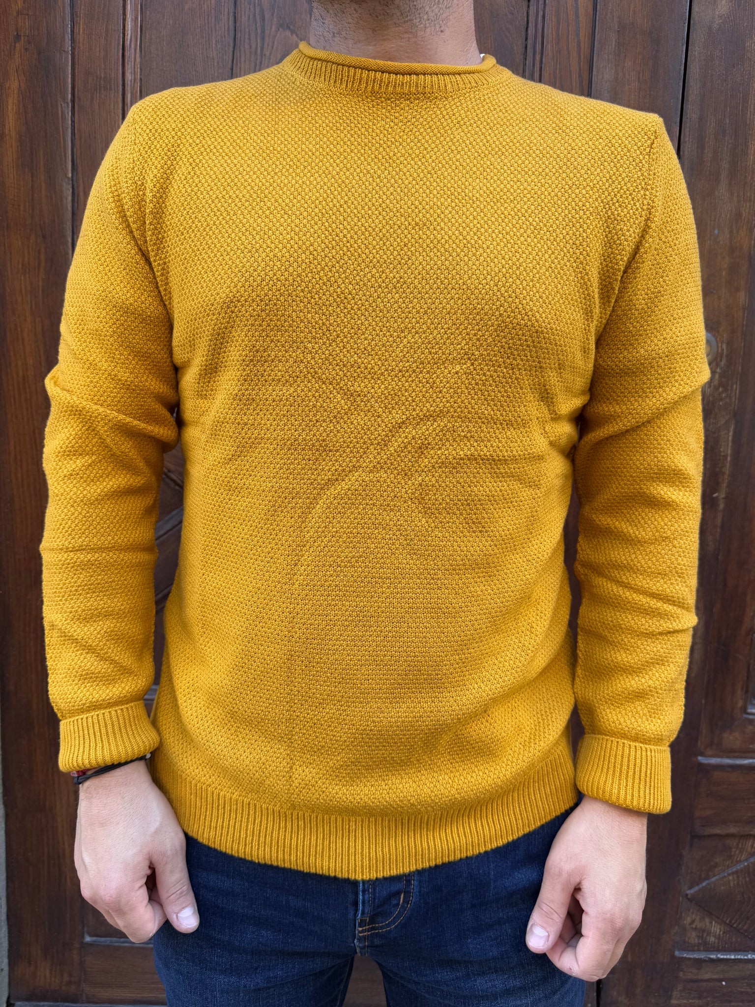 Maglioncino Carlos di Telamira, girocollo, trama Chicco di riso, misto lana leggero, morbido e calduccio, vestibilità regular, il modello è alto 1.70 per 77 kg e indossa una M.