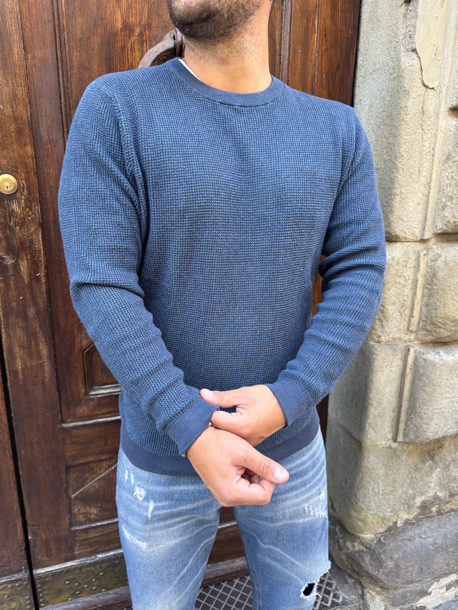 Maglioncino Dexter di Tiffosi, girocollo , trama operata, vestibilità regular, il modello è alto 1.70 per 80 kg e indossa una M. Disponibile blu e tortora.