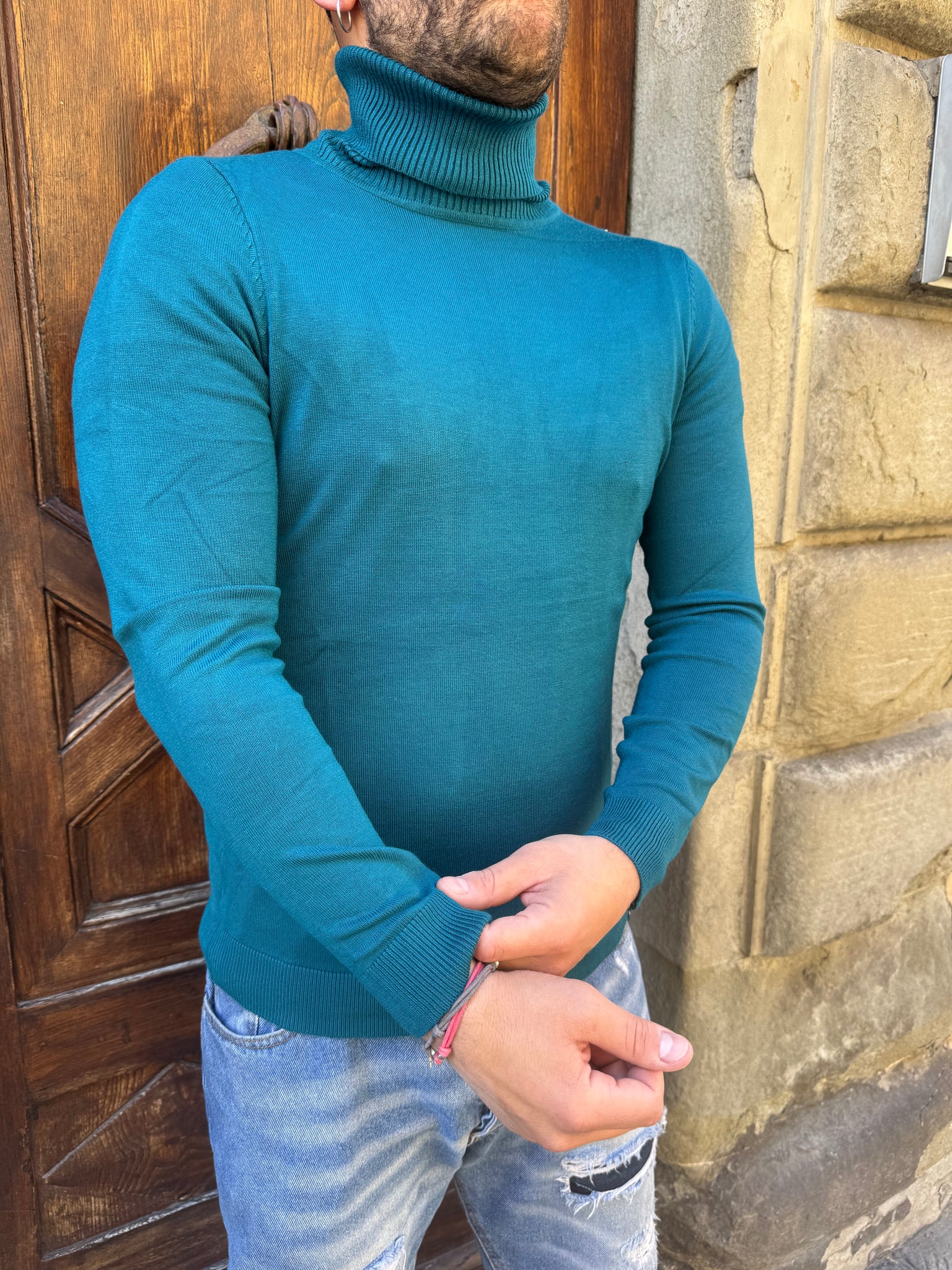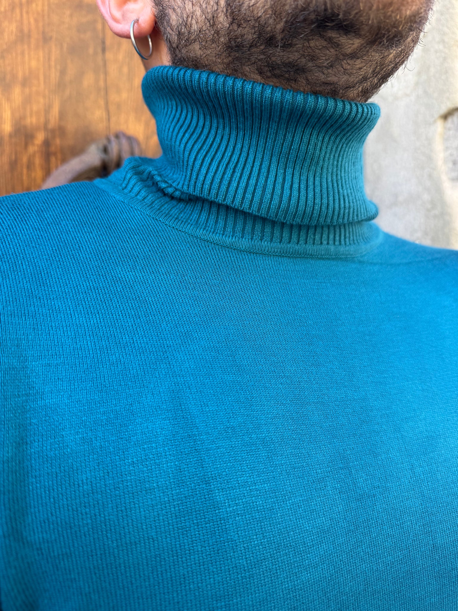 Maglioncino Dolcevita di Telamira in viscosa, vestibilità slim, il modello è alto 1.70 per 77 kg e indossa una M. Disponibile : panna, ottanio,blu , senape e bordeaux.