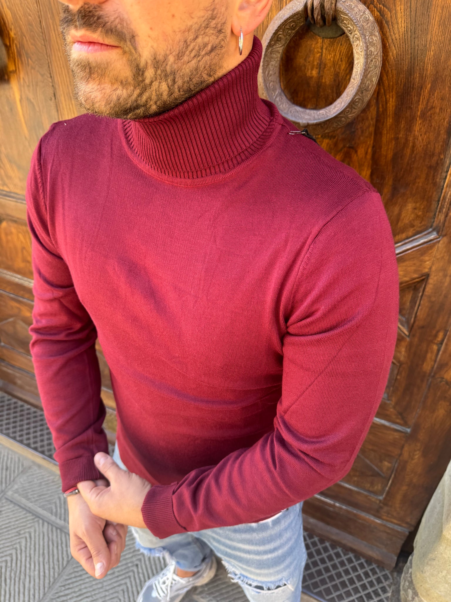 Maglioncino Dolcevita di Telamira in viscosa, vestibilità slim, il modello è alto 1.70 per 77 kg e indossa una M. Disponibile : panna, ottanio,blu , senape e bordeaux.