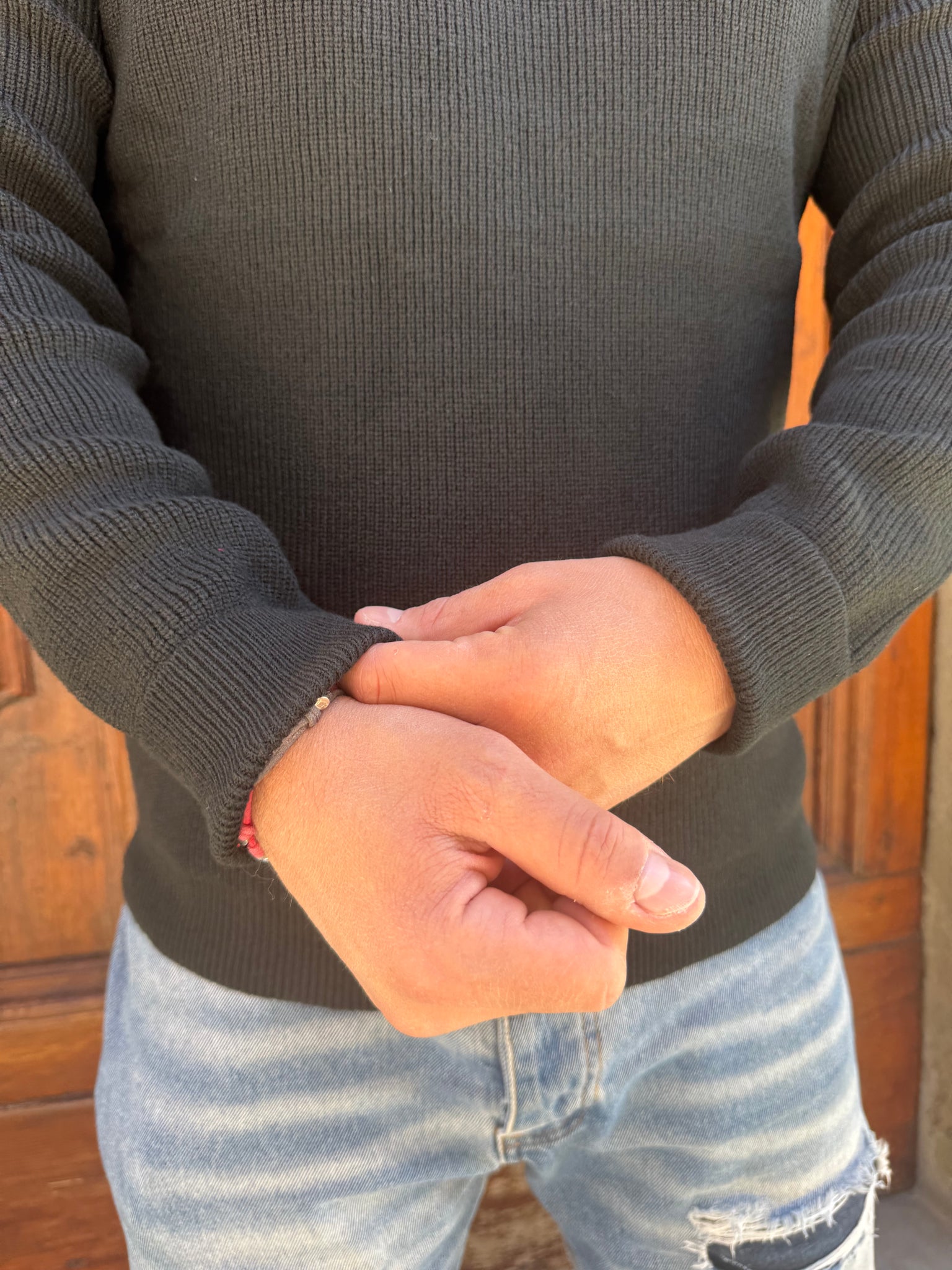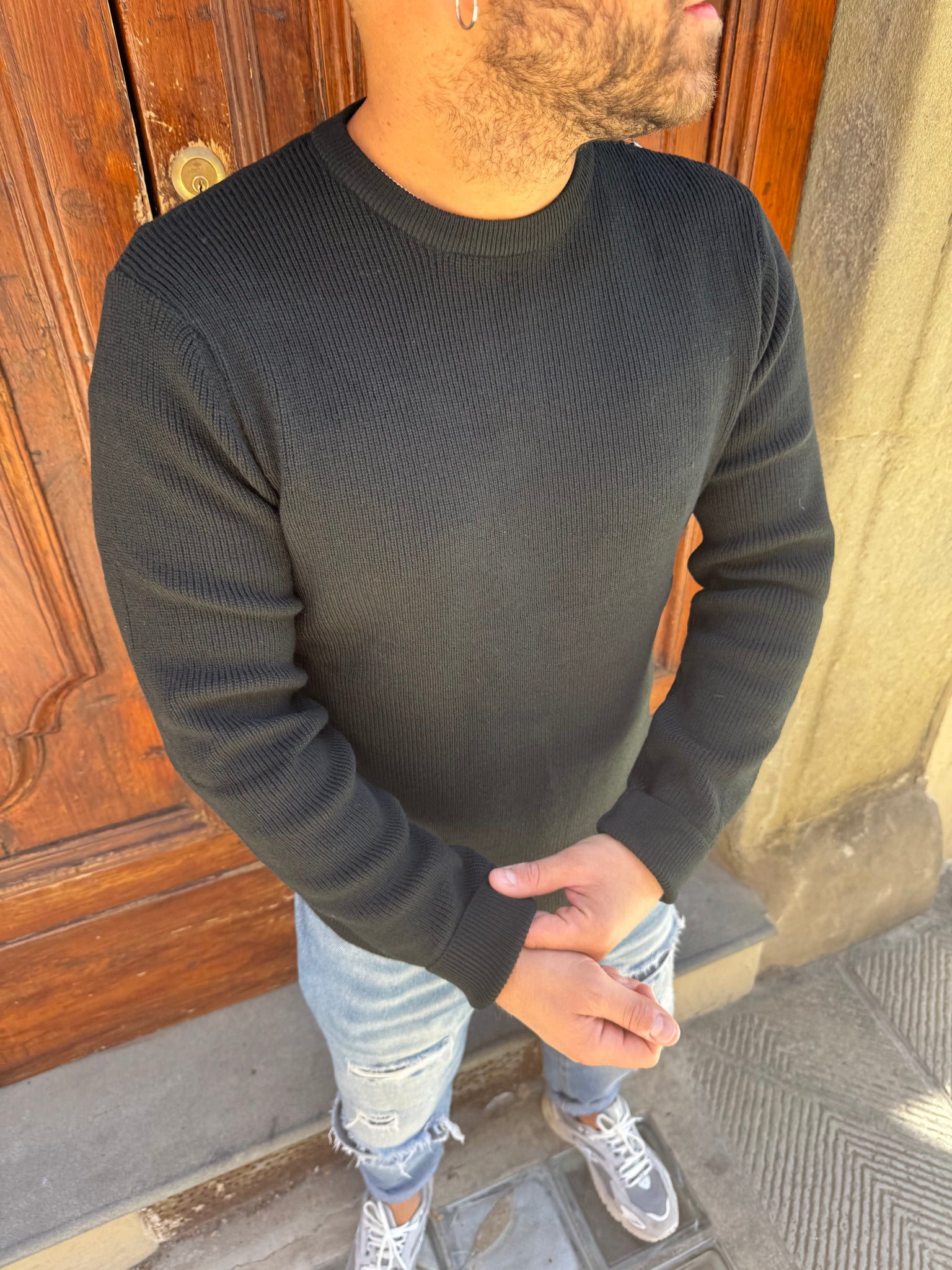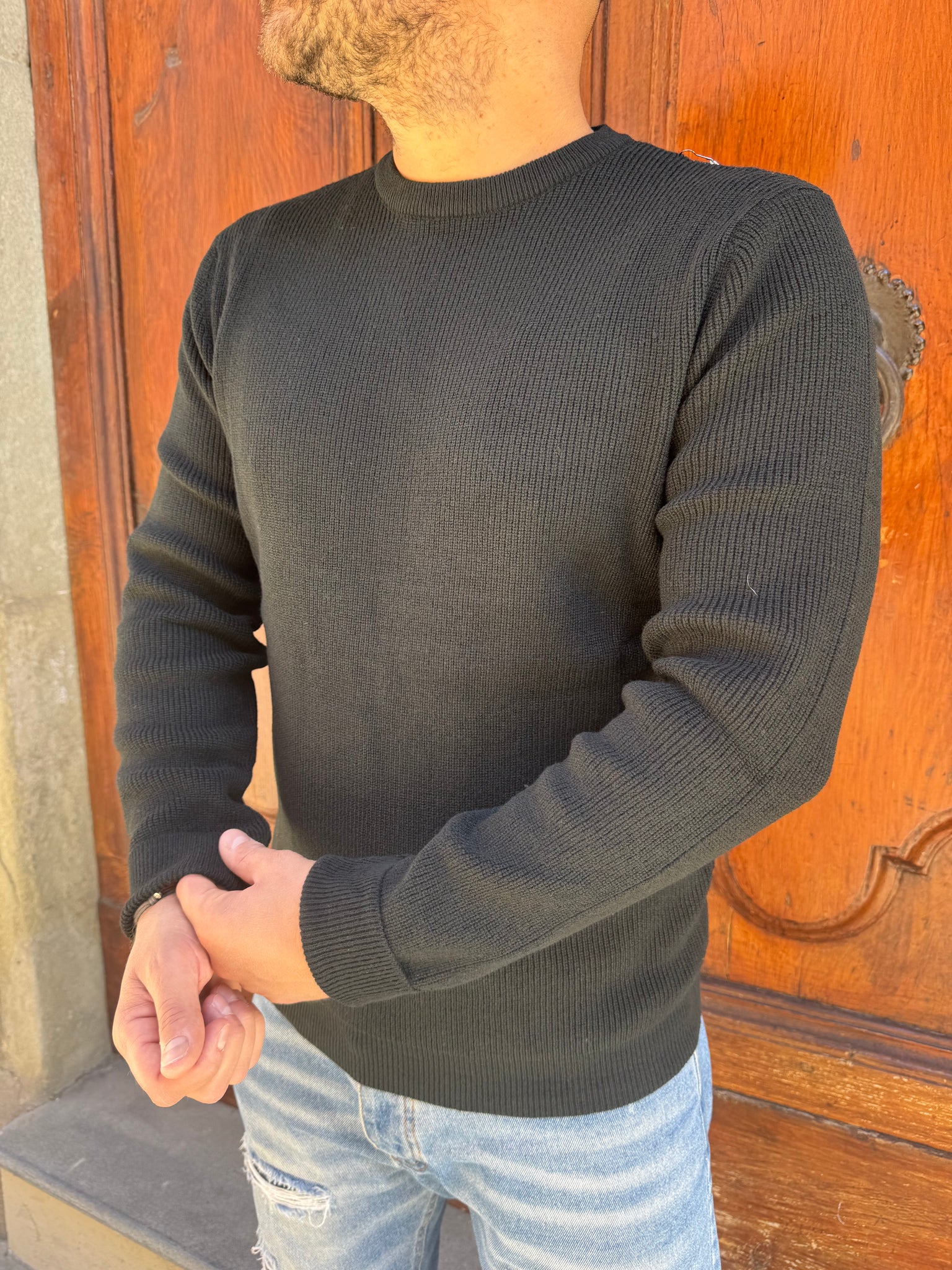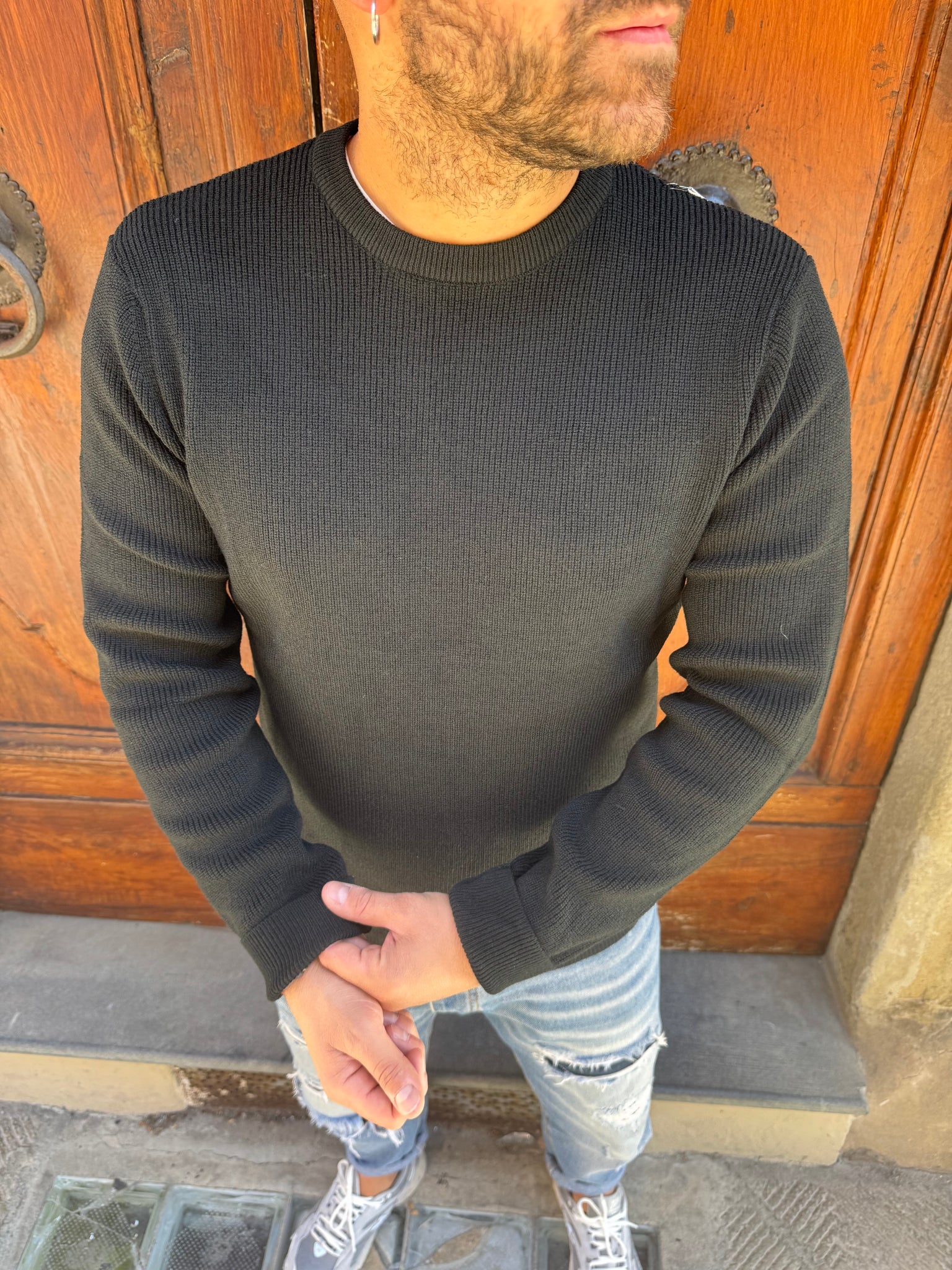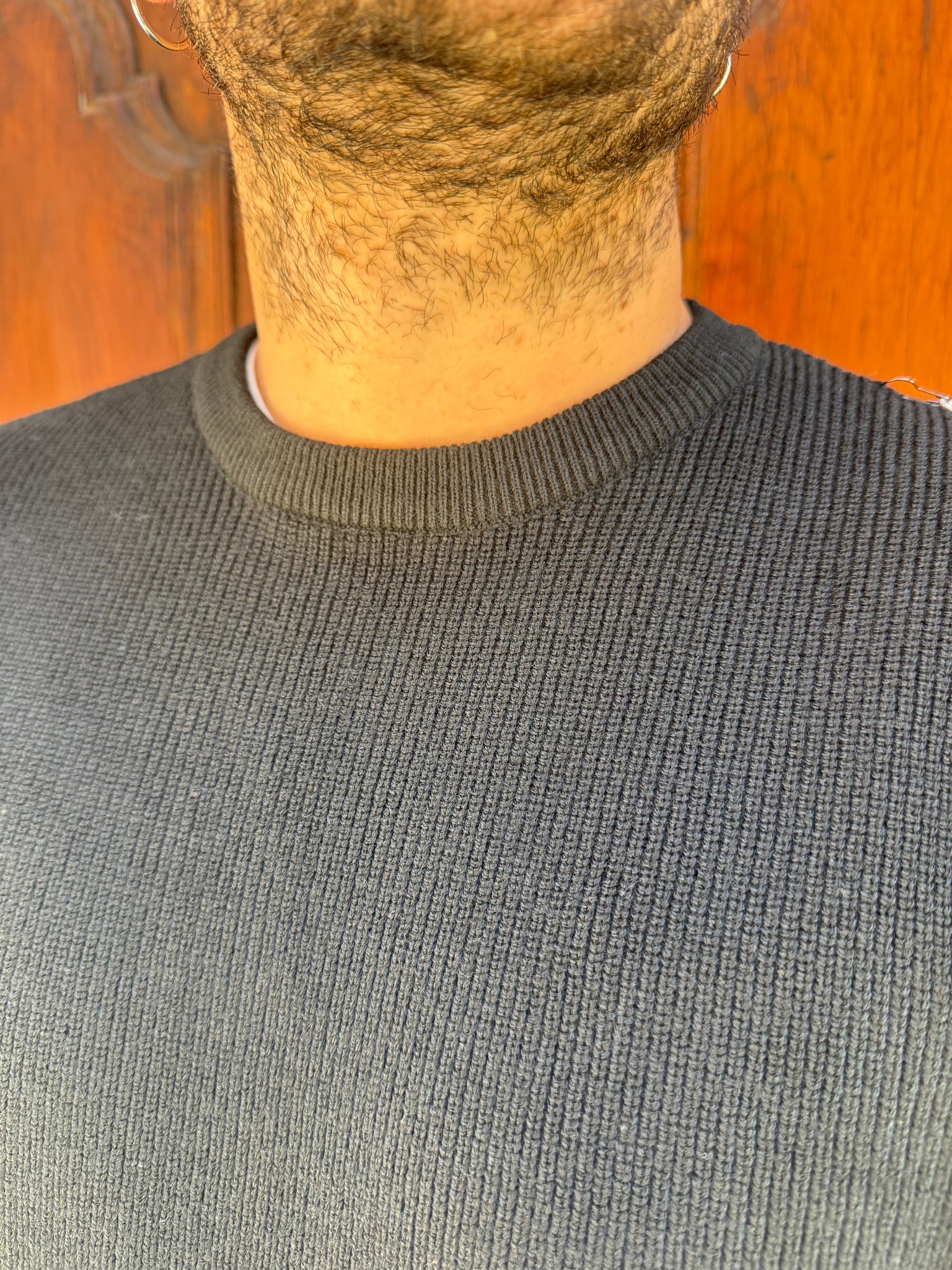 Maglioncino Sunday di Telamira, girocollo , trama microcosta inglese, misto lana, vestibilità slim, il modello è alto 1.70 per 77 kg e indossa una M. Disponibile nero , blu o beige .