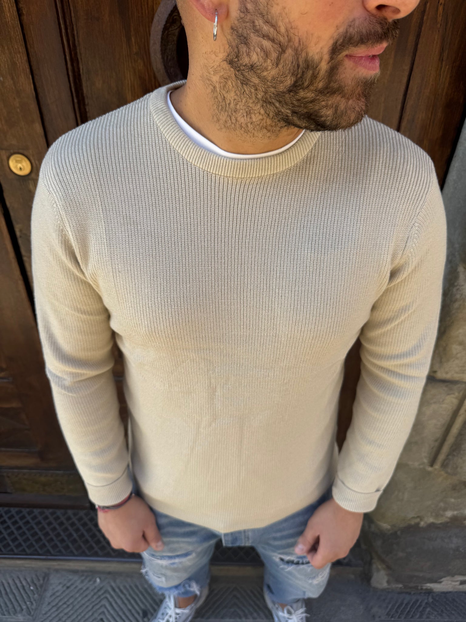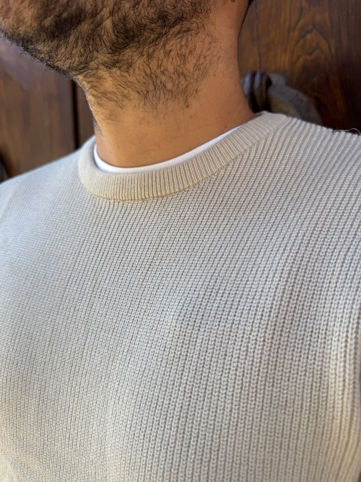 Maglioncino Sunday di Telamira, girocollo , trama microcosta inglese, misto lana, vestibilità slim, il modello è alto 1.70 per 77 kg e indossa una M. Disponibile nero , blu o beige .