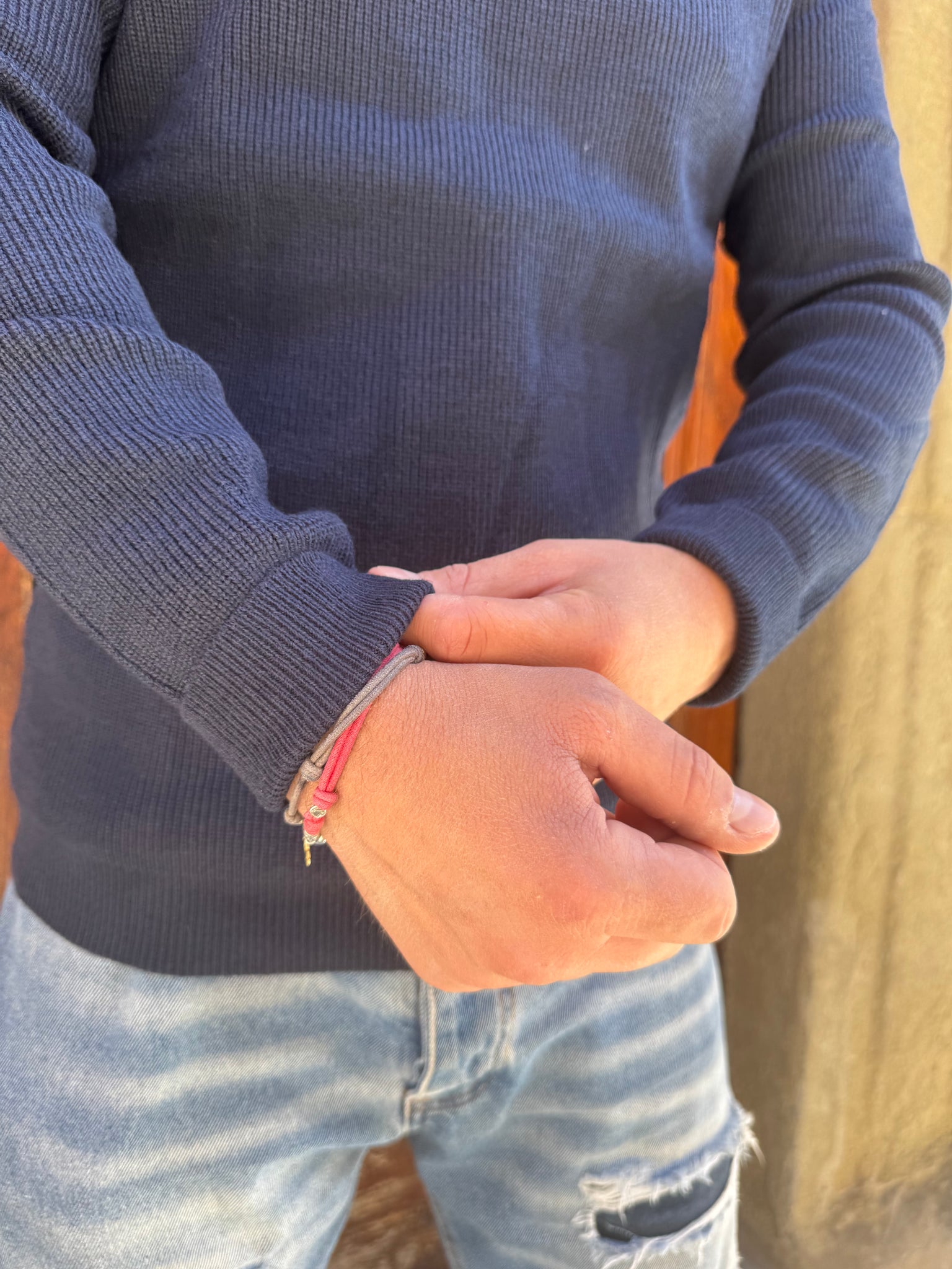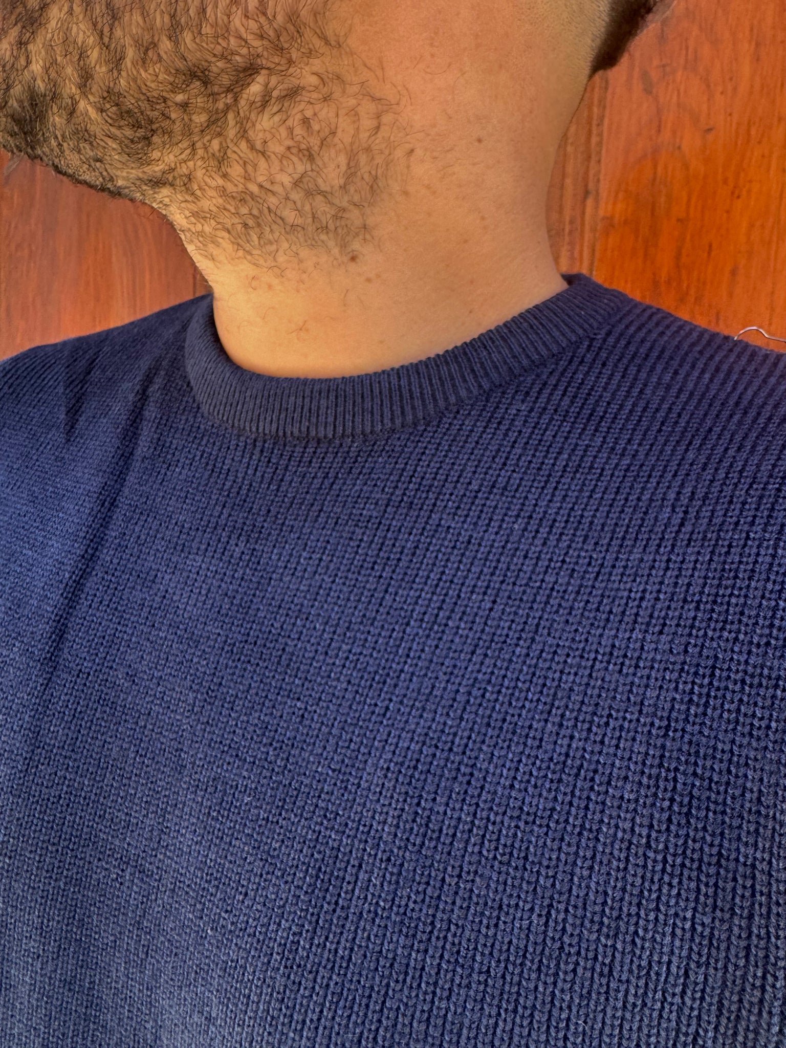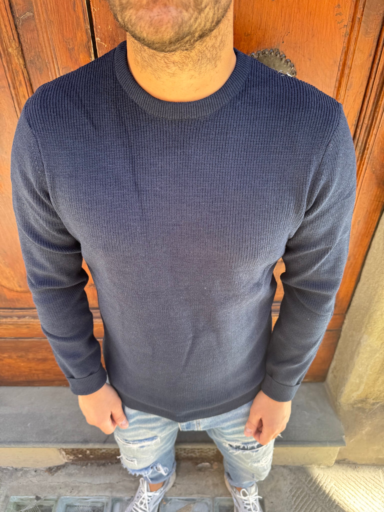 Maglioncino Sunday di Telamira, girocollo , trama microcosta inglese, misto lana, vestibilità slim, il modello è alto 1.70 per 77 kg e indossa una M. Disponibile nero , blu o beige .