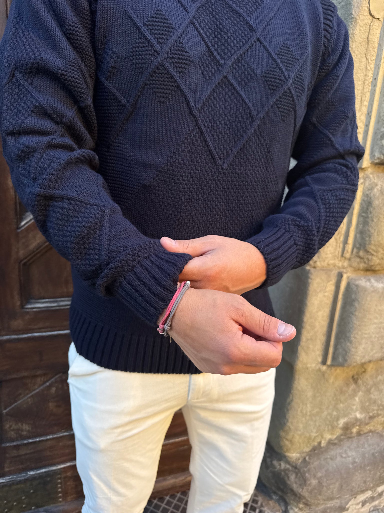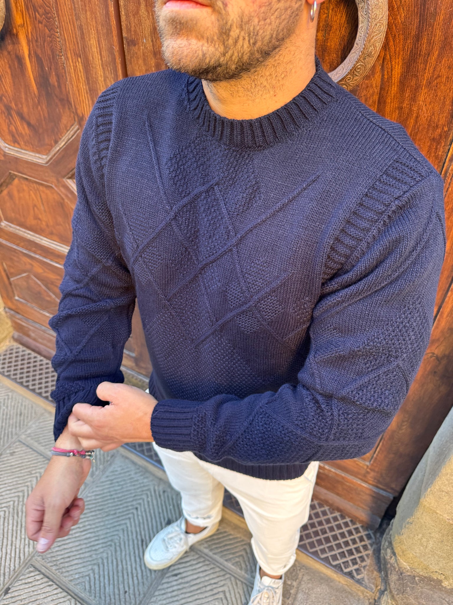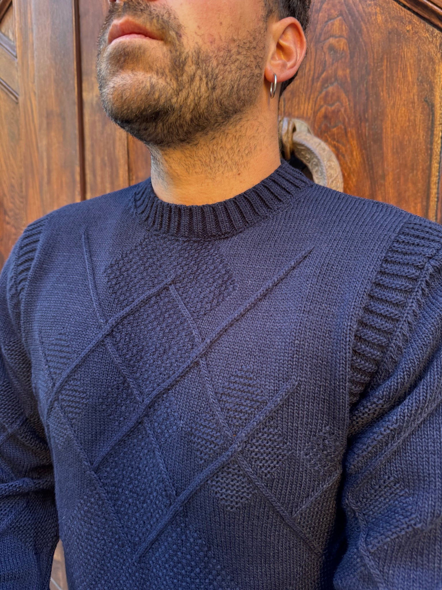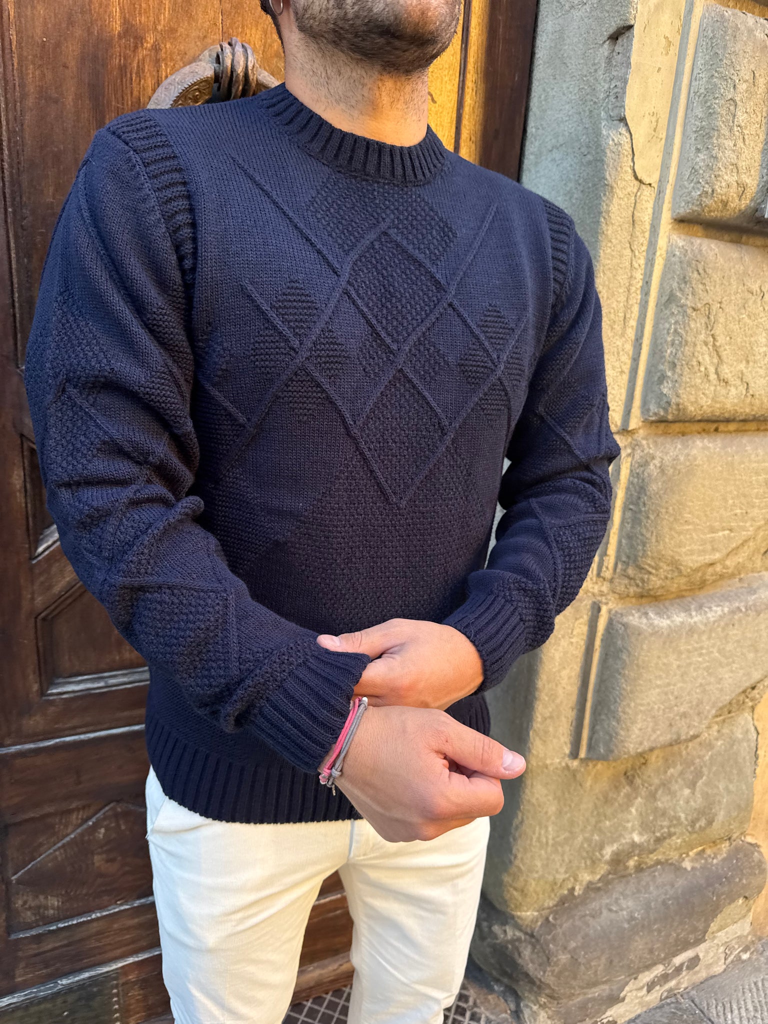 Maglioncino Rombo di Telamira, girocollo, trama a rombo, misto lana, vestibilità regular, il modello è alto 1.70 per 77 kg e indossa una M. Disponibile blu, panna, verde e ruggine .