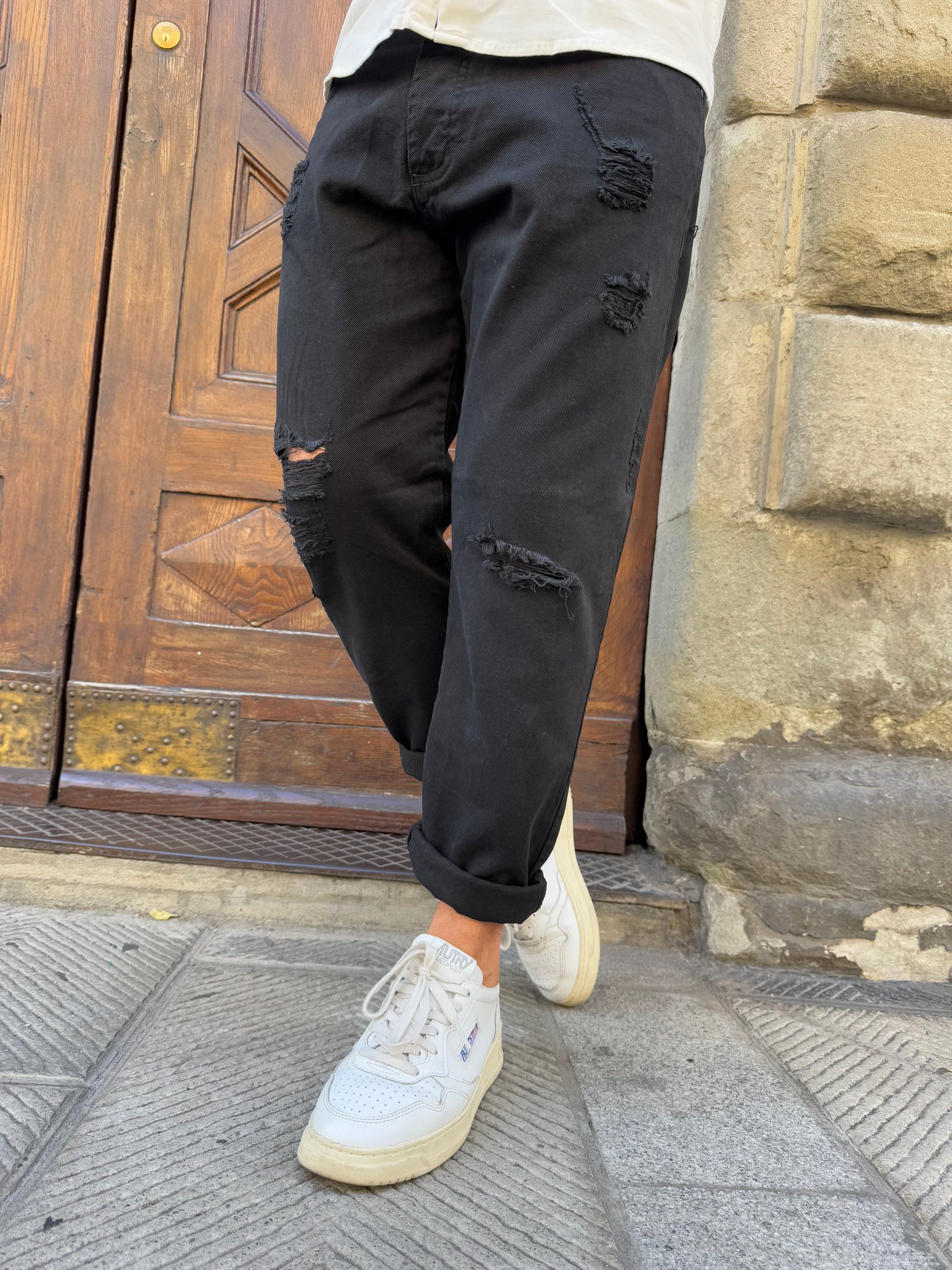 Pantalone Bulldenim di Myden, cotone leggermente elasticizzato, strappi e abrasioni frontali e sulle tasche posteriori , vestibilità Cropped, il modello è alto 1.70 per 77 kg e indossa una 46. Due colori disponibili: nero e sabbia .
