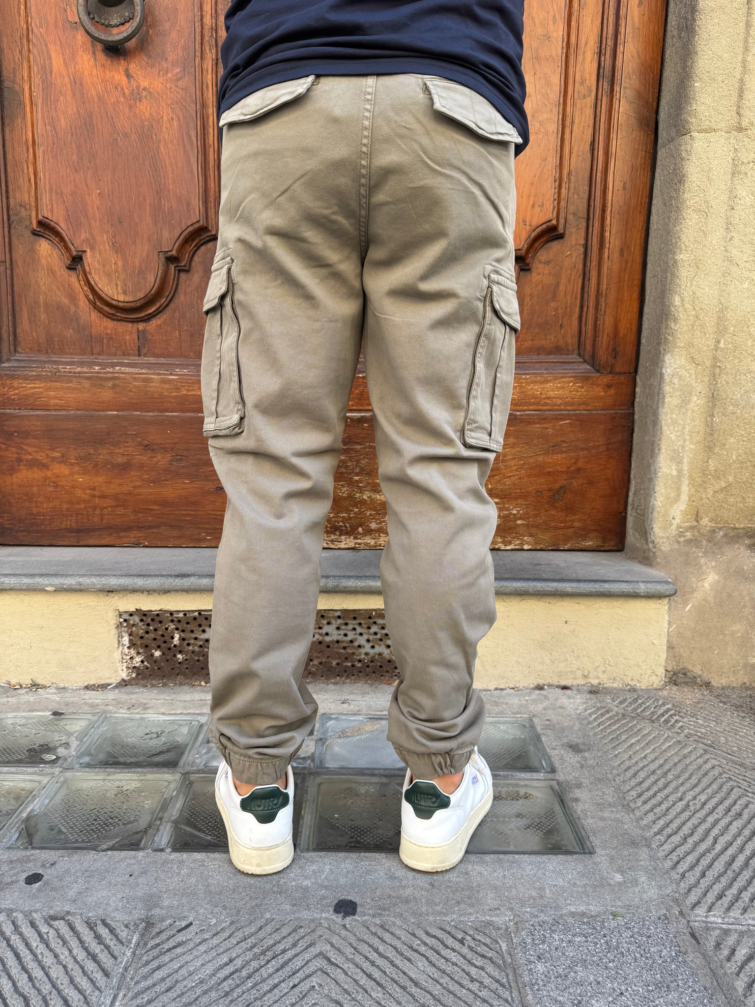Pantalaccio Cargo di Petrol, tasche laterali, polsino alle caviglie , coulisse in vita, vestibilità regular, il modello è alto 1.70 per 77 kg e indossa una S.