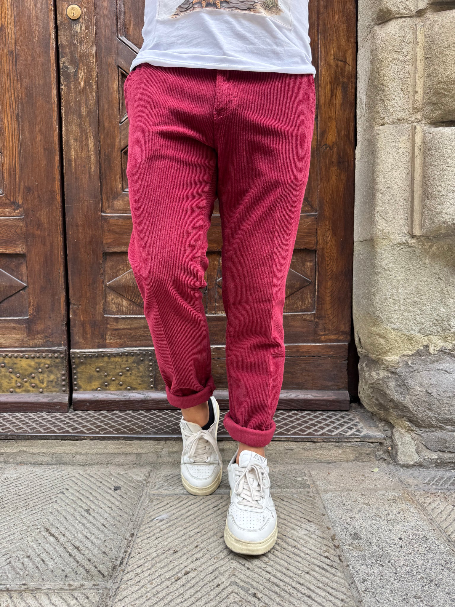 Pantalone chinos a costine in velluto di Telamira, morbido e dal fit slim, il modello è alto 1.70 per 80 kg e indossa una 48.