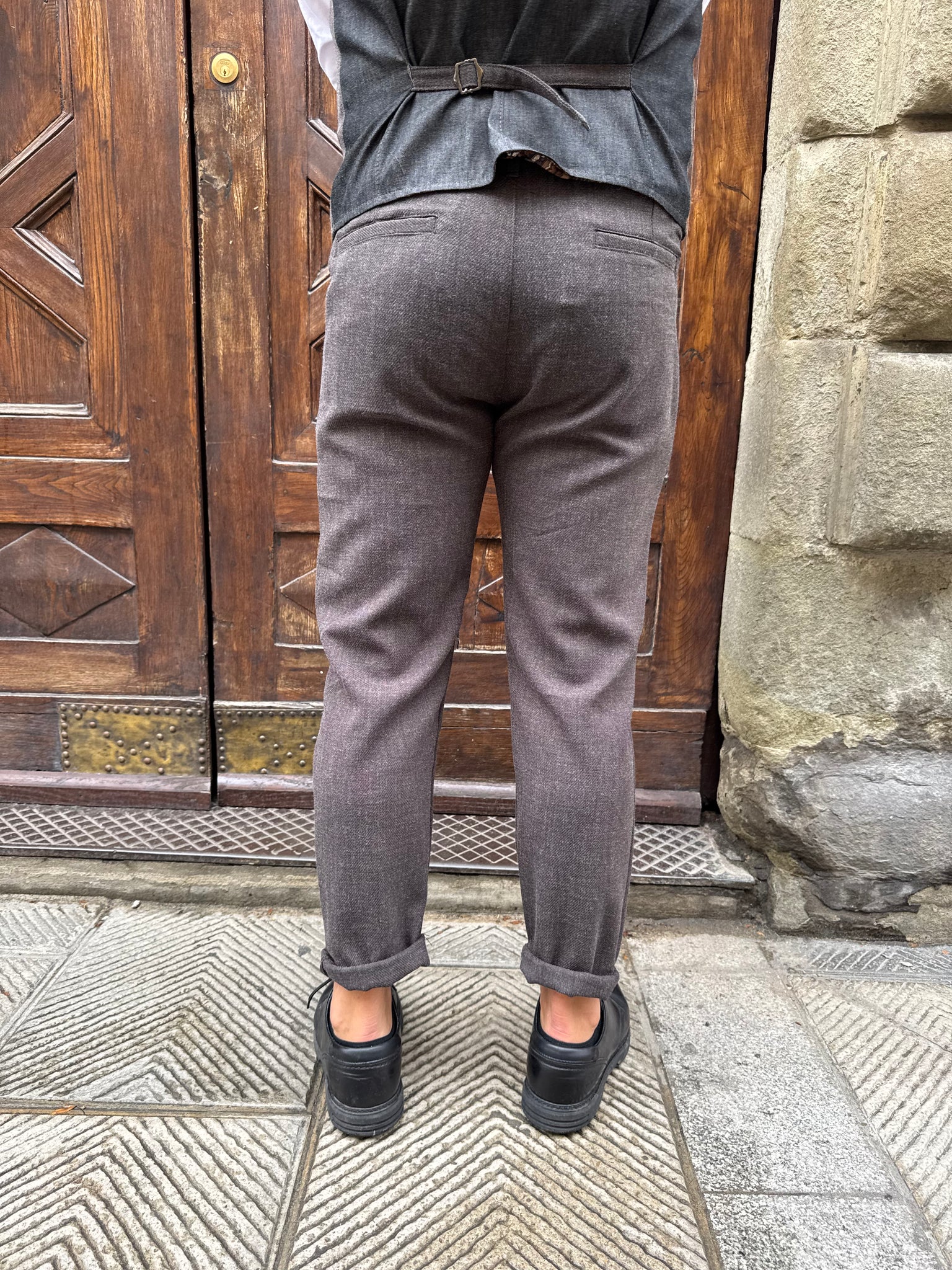 Pantalone coordinato London di 3.9, pences frontali, leggermente elasticizzato per il massimo della comodità, vestibilità slim , il modello è alto 1.70 per 77 kg e indossa una 44. Disponibile blu jeans, marrone e grigio.
