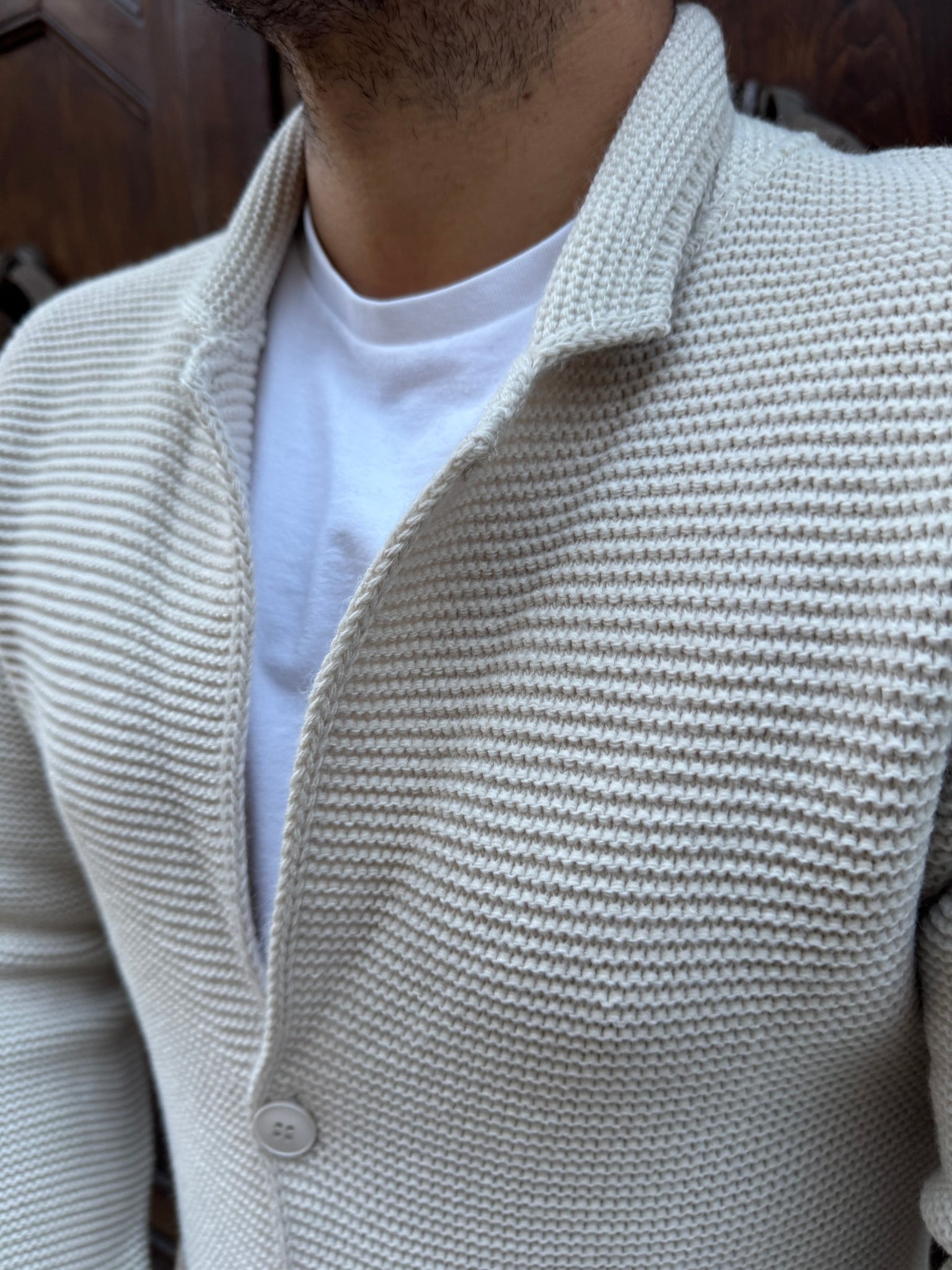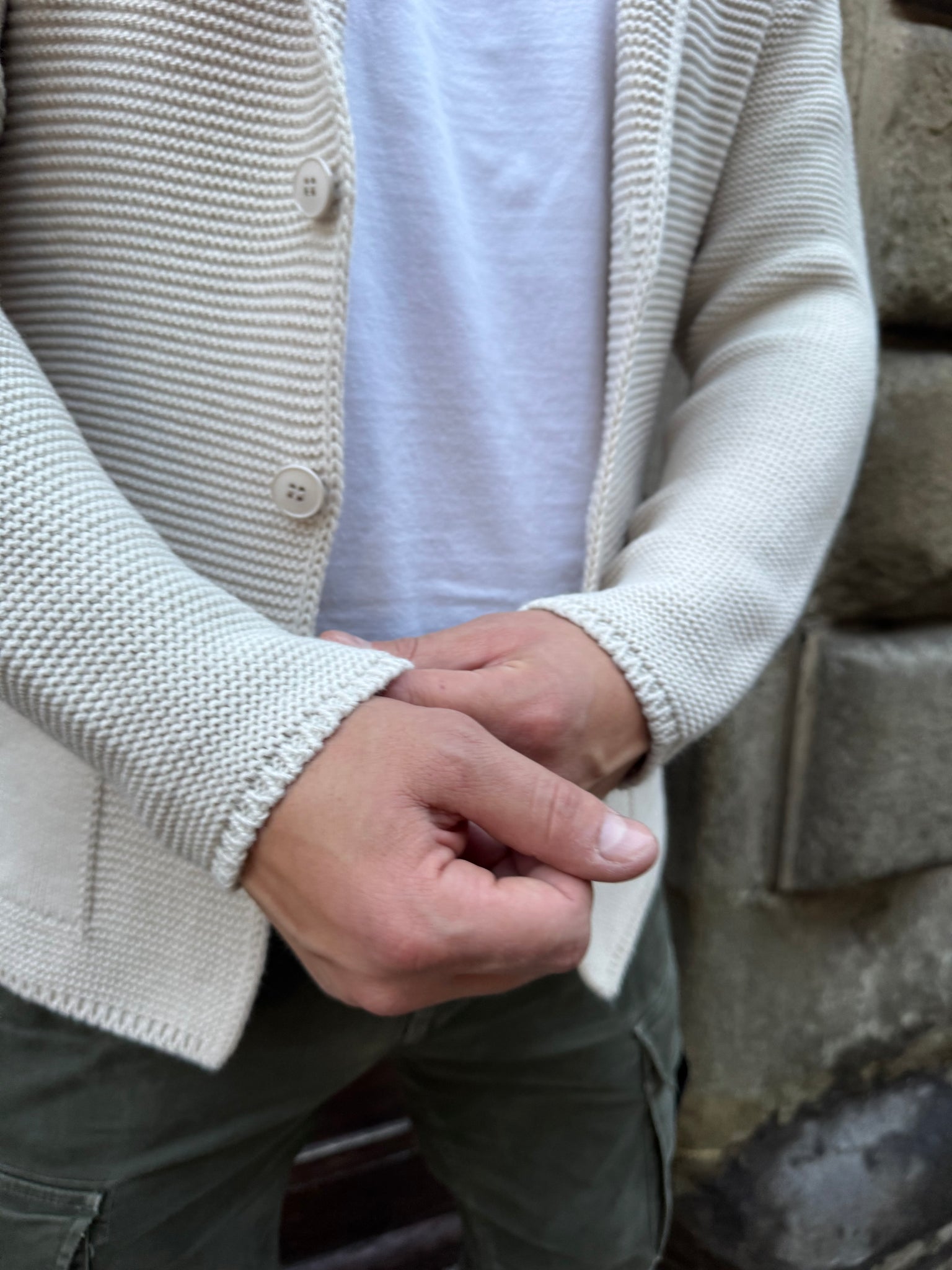 Descrizione: Cardigan Lucio di 3.9 panna, in misto lana, trama operata, con scollo a giacca e tasche a toppa.