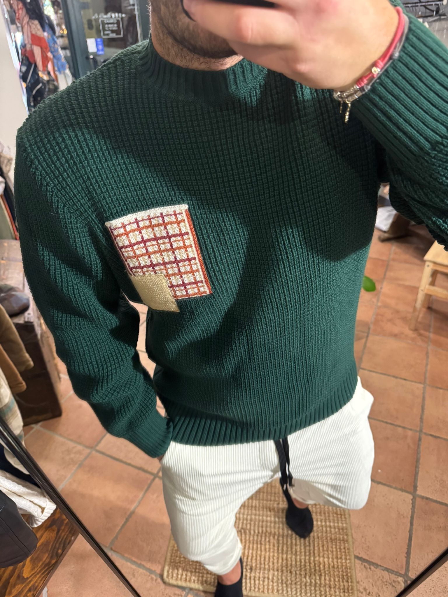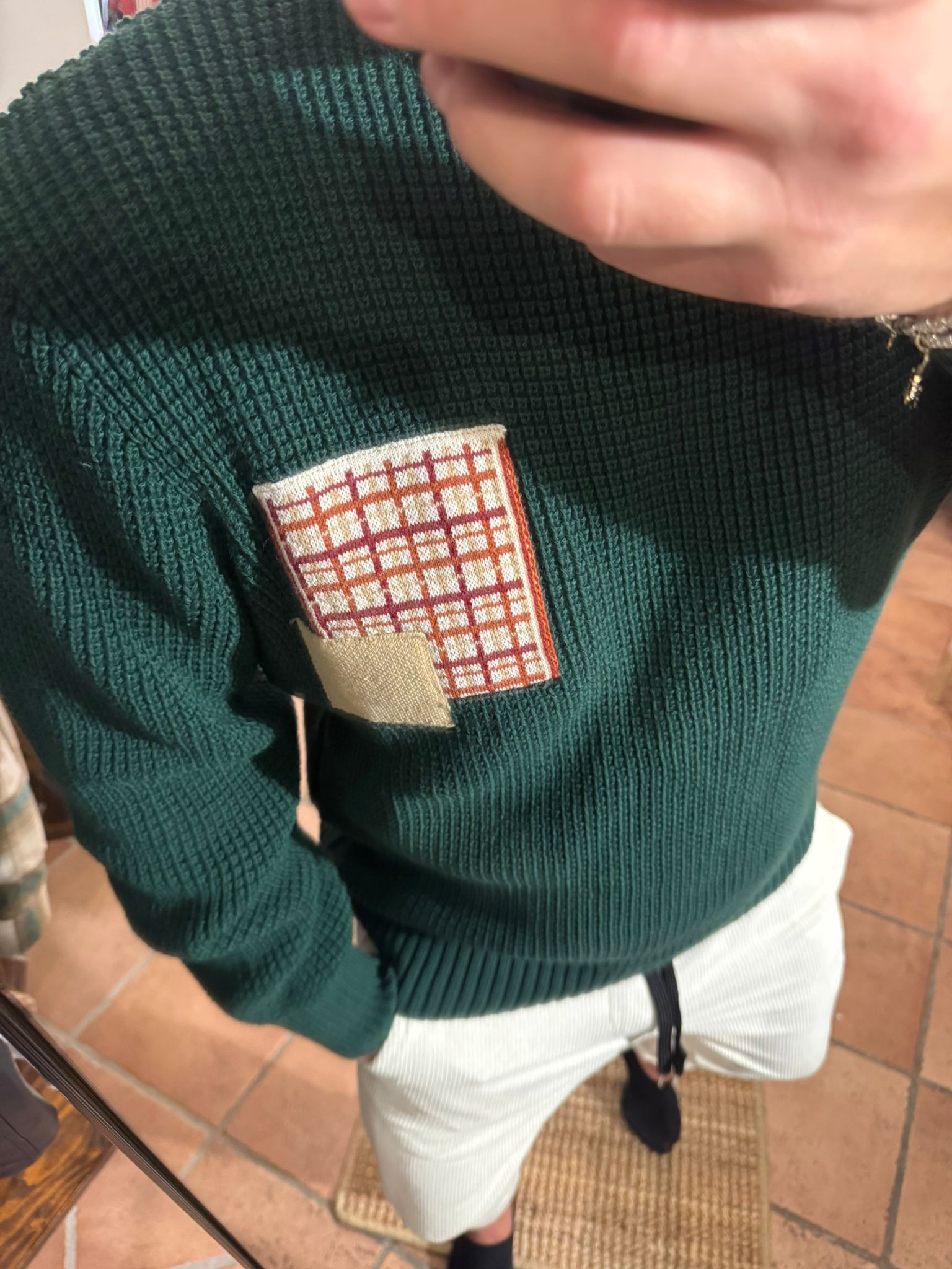 Maglioncino Patch di Telamira verde, misto lana (50%) e acrilico (50%), costa inglese, patch altezza cuore.